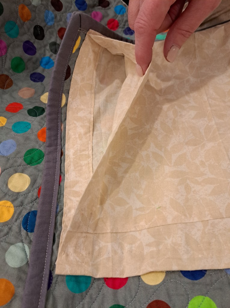 This particular quilt has a mitered border, so she carefully hand sews the sleeve with hand stitches across the mitered section to the edge of the quilt where the border seam meets the miter. Hand sewing shown below above my finger, while the machine stitching line is below my finger. Brilliant!!