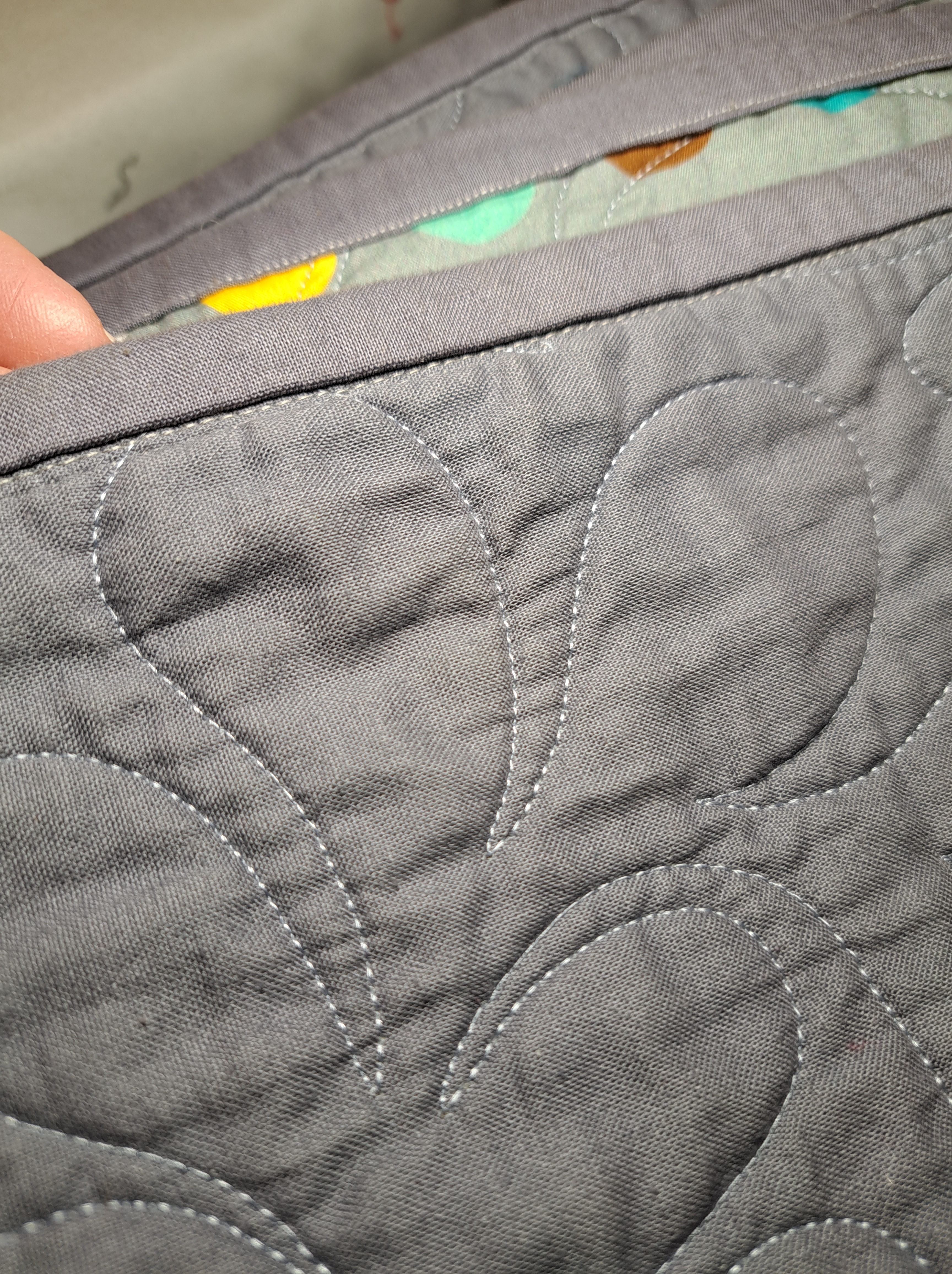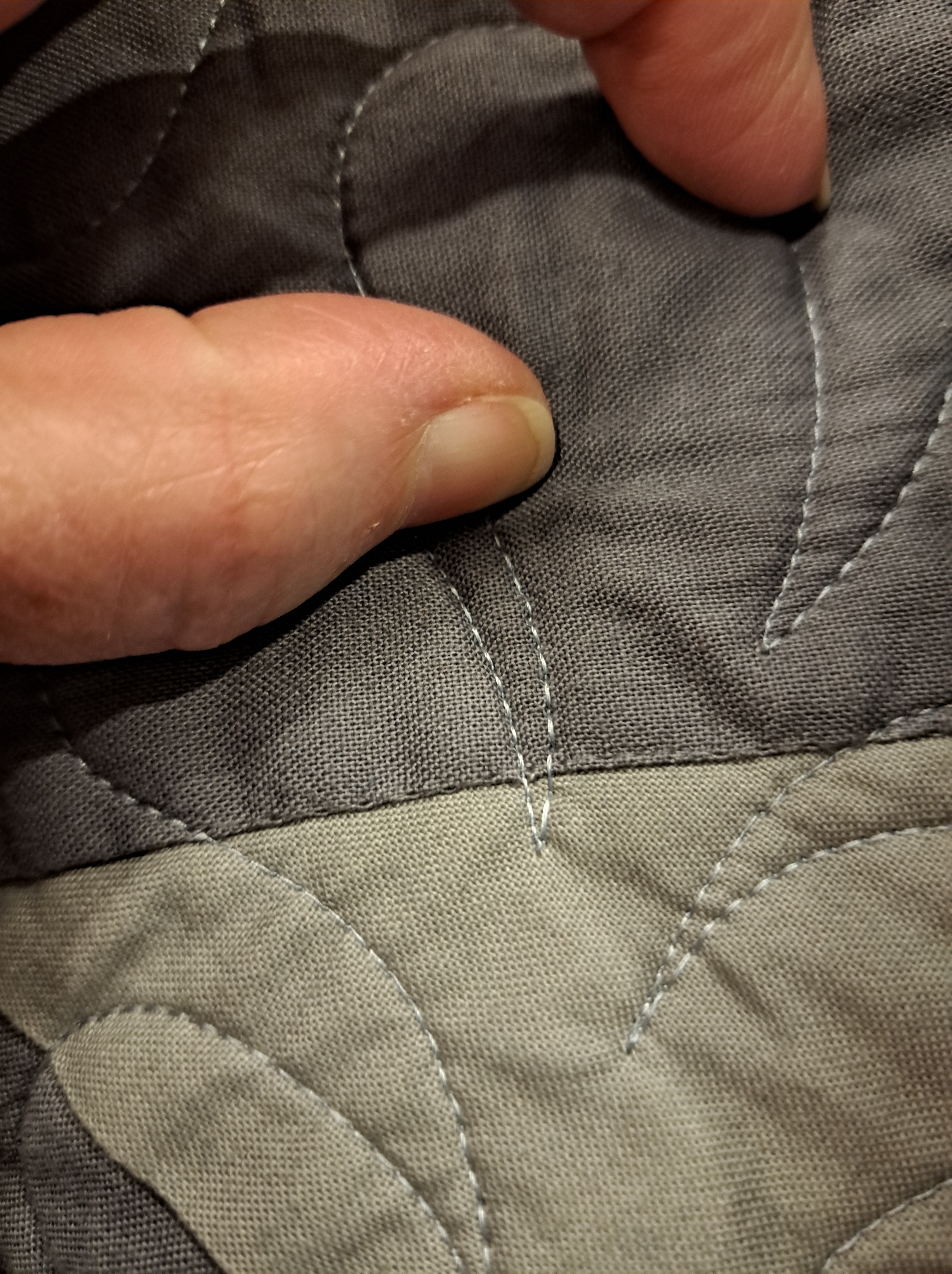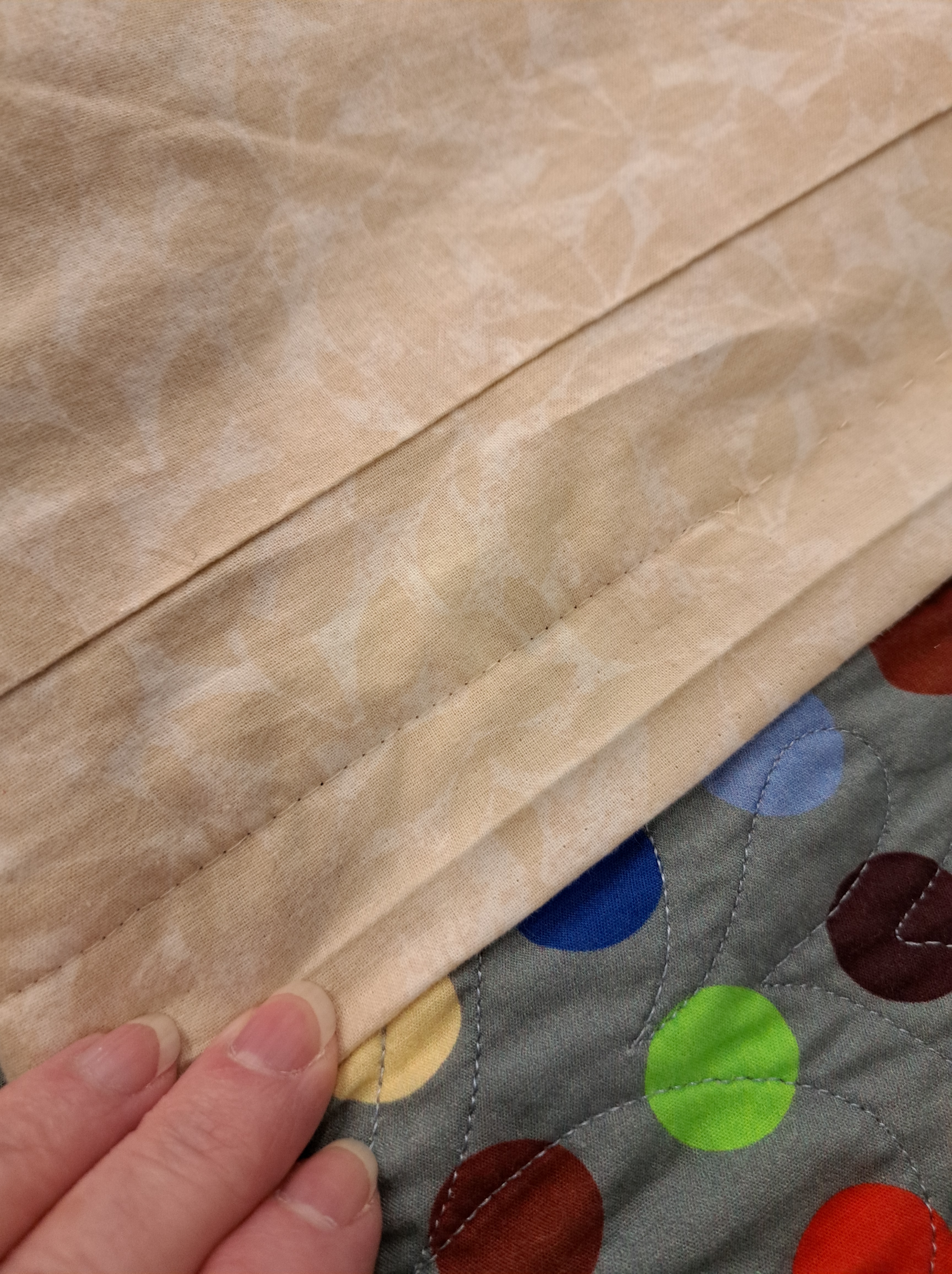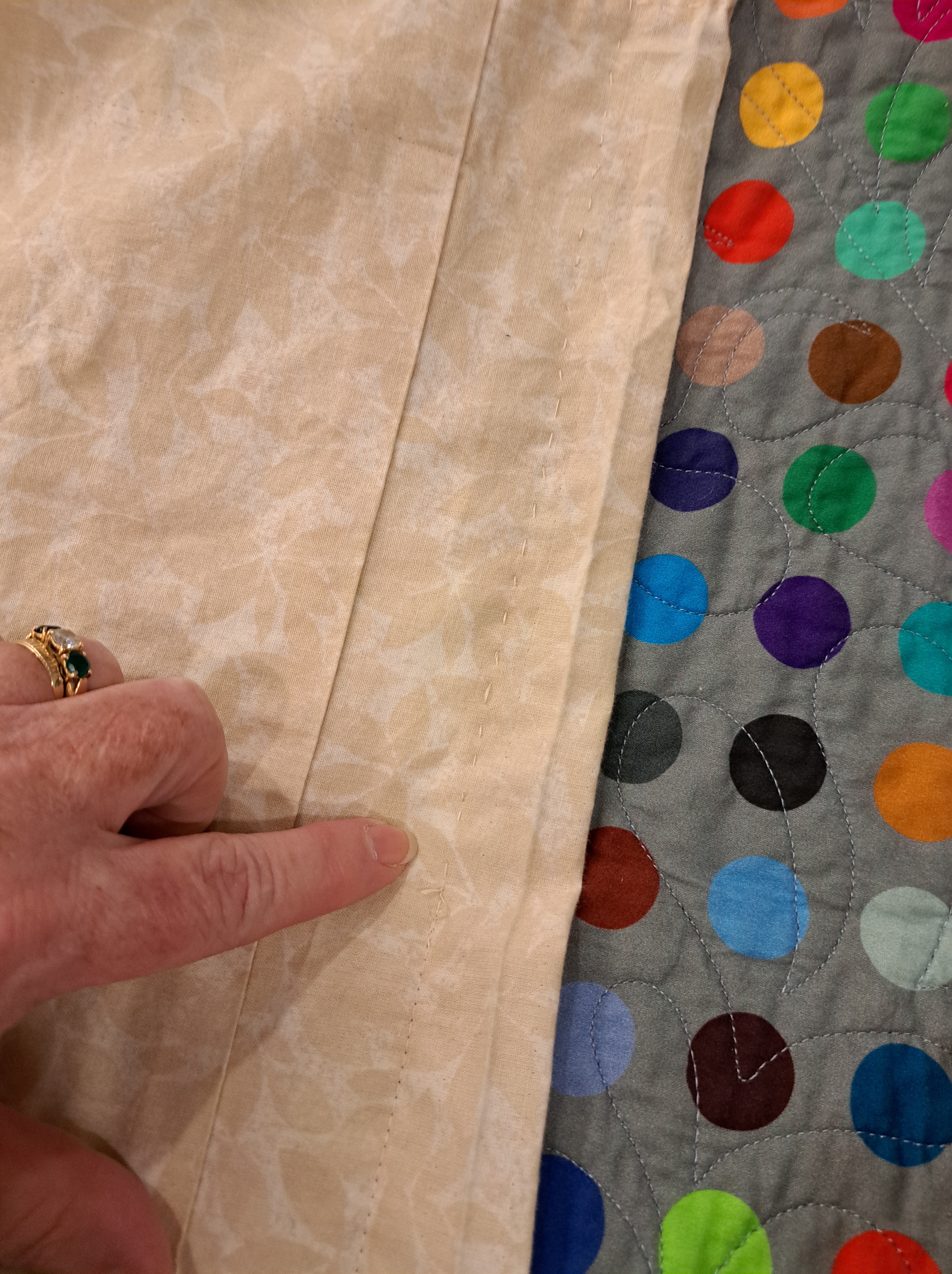This particular quilt has a mitered border, so she carefully hand sews the sleeve with hand stitches across the mitered section to the edge of the quilt where the border seam meets the miter. Hand sewing shown below above my finger, while the machine stitching line is below my finger. Brilliant!!
