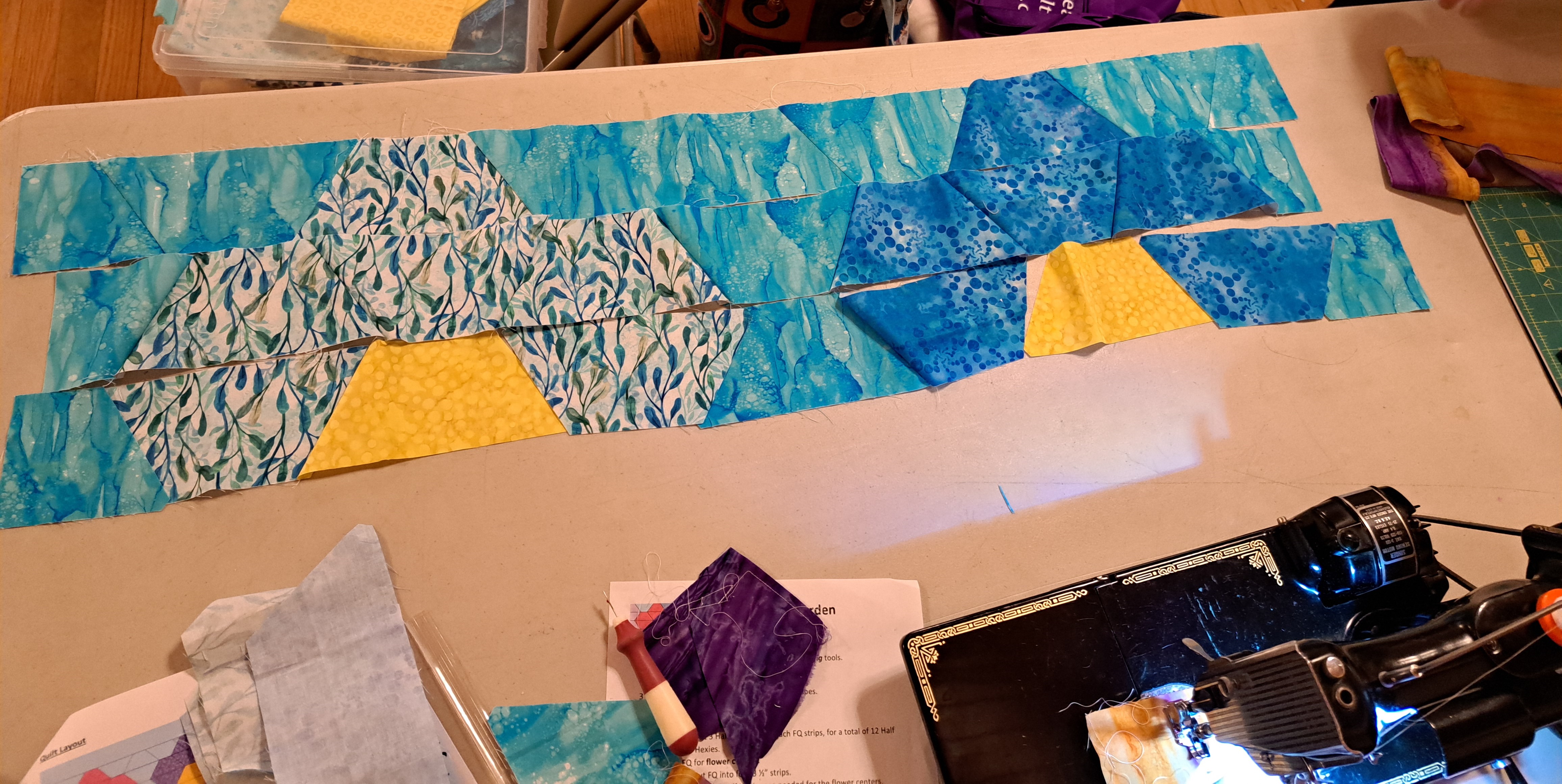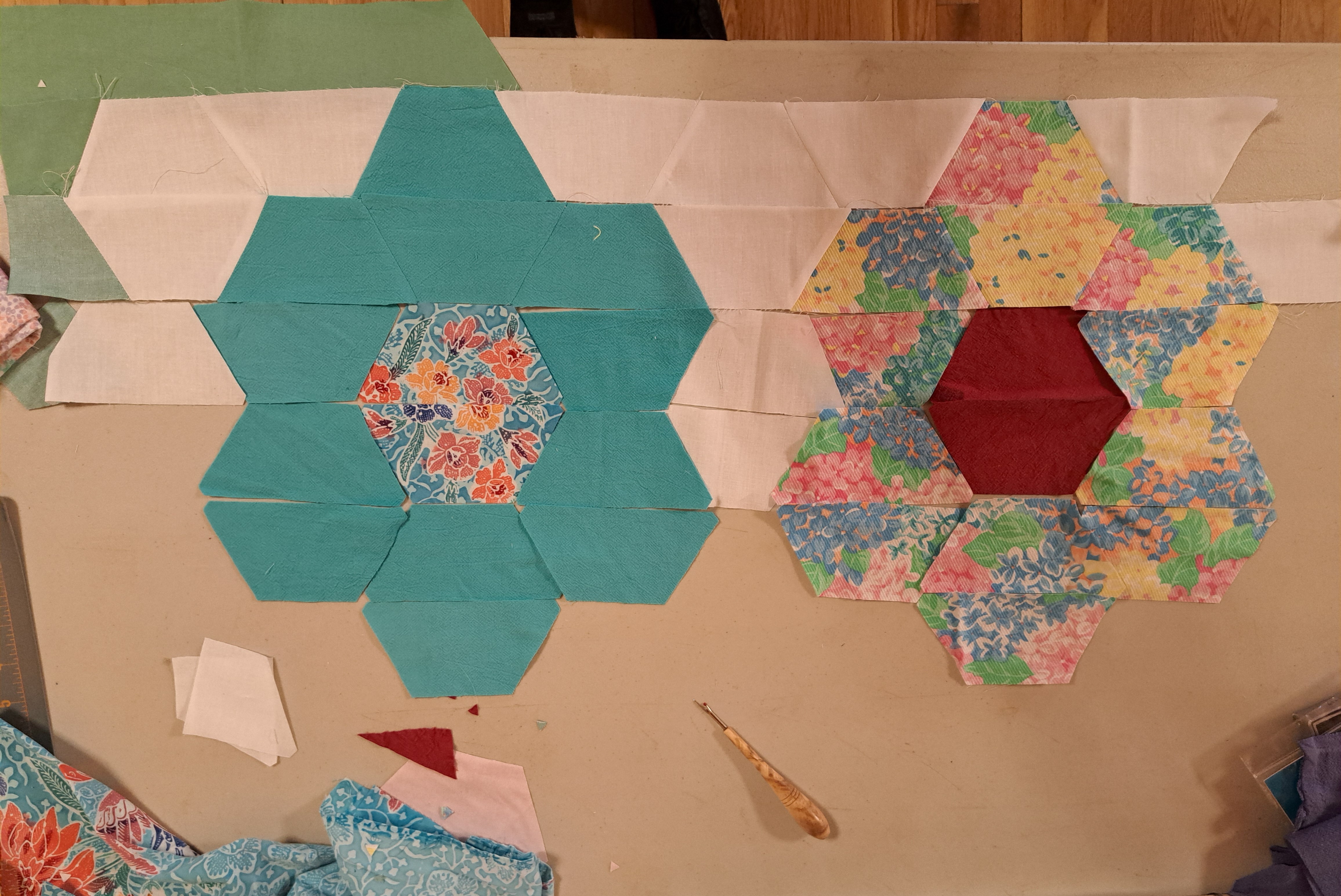And a special use of old favorites. The fabrics used for these flowers are from Grandma’s clothes. She was a lover of gardening and all things flowering. I’m looking forward to seeing the results of using these treasures. A note – she used Hex-a-ma-jig Jr. as she wanted smaller flowers to get the best use the clothes she was using.