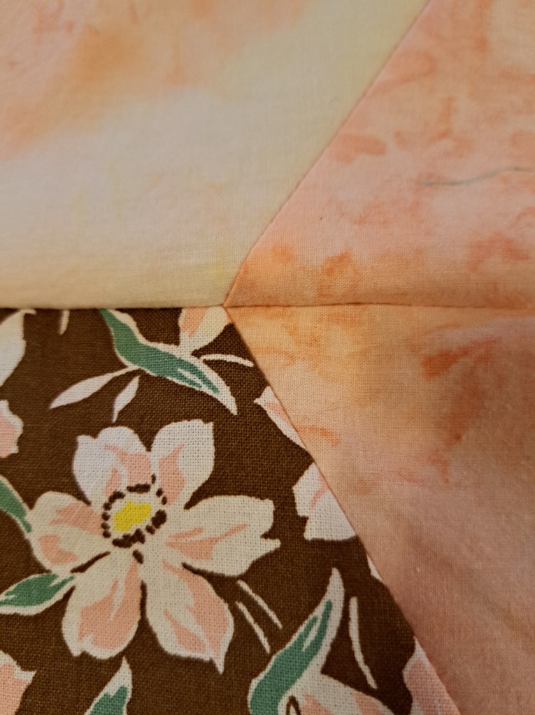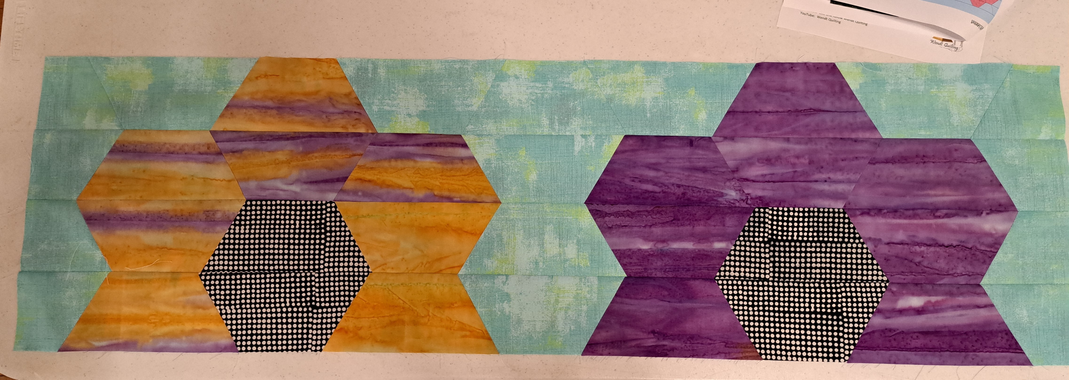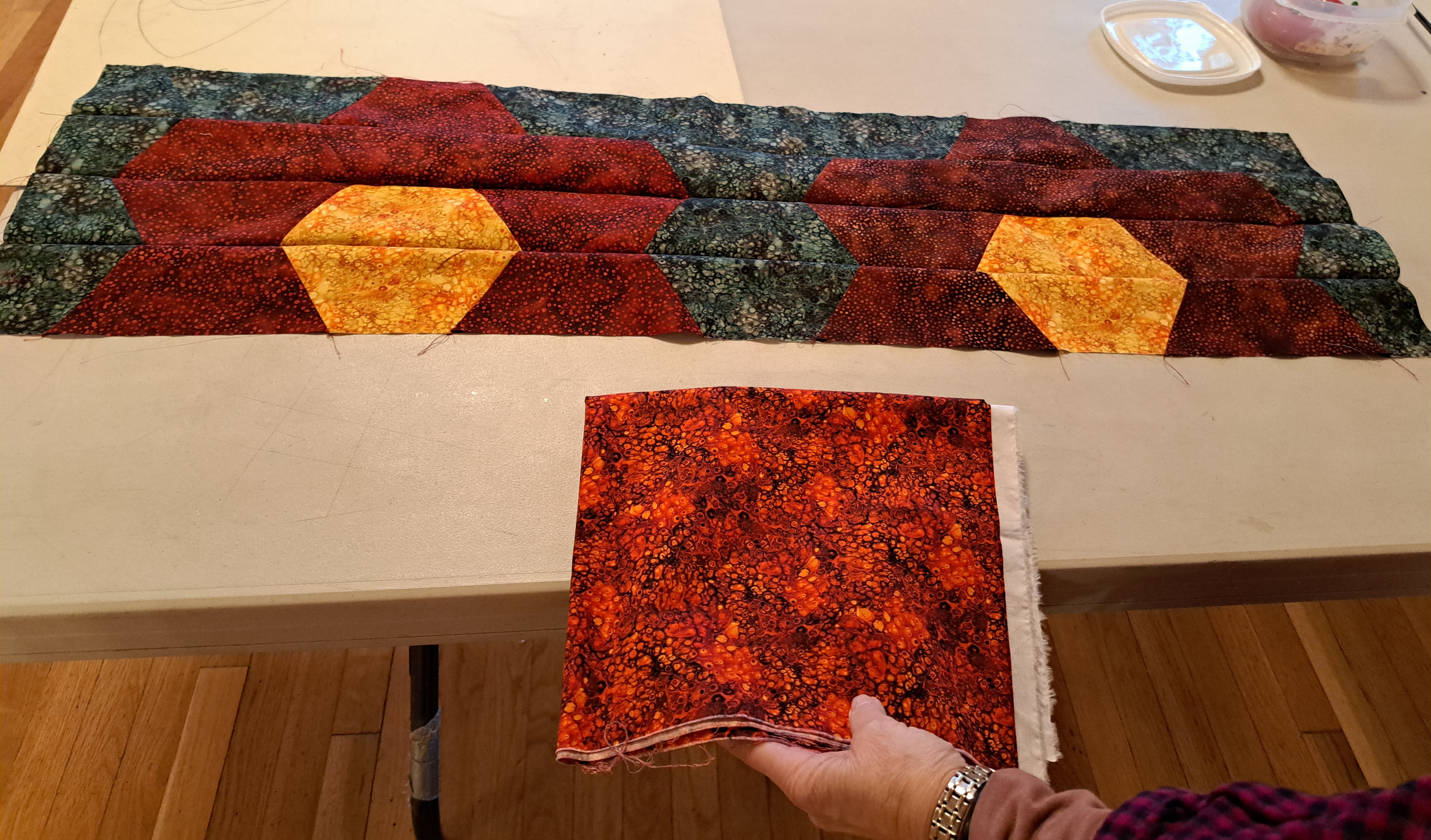 We had several “Ah ha” moments. Those are the best in any workshop! The first was how exact you can get seams to match with the “lopped off” points cutting the shape of the Hex-a-ma-jig. By cutting off those “bunny ears” it helps get a perfect 1/4″ seam line. Plus, when sewing the rows together it also helps in matching up the seams to have nice intersections. See the proof below! She was thrilled, telling me those were some of the best intersections she had ever sewn. Yay!!! Well done!