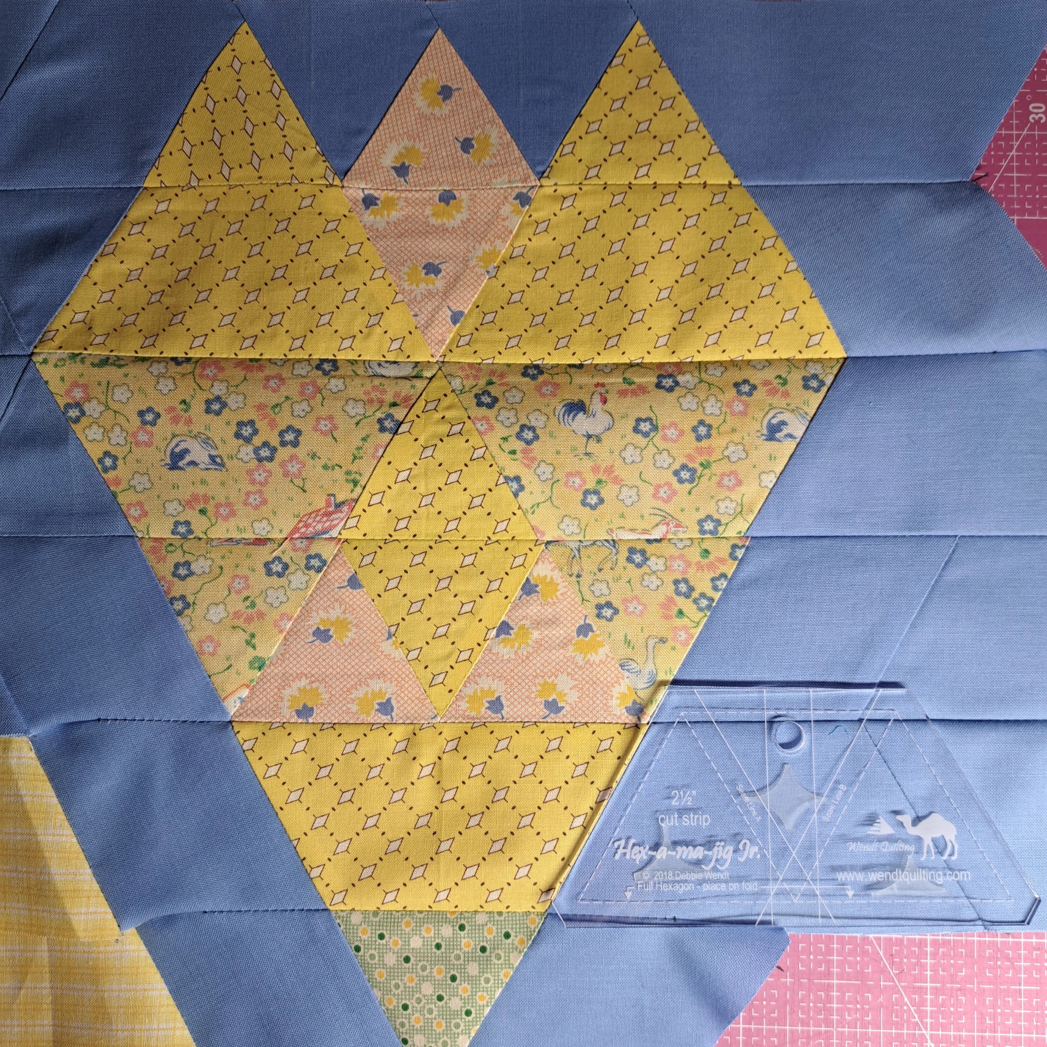 Yesterday marked the finish of the Yellow Tulip quilt block Designer Remix. Several quilt designers remix a different quilt block each month. I used my Hex-a-ma-jig Jr. and 2 1/2″ strips to REMIX the tulip using hexie shapes. Below are a few of the photos. First the Yellow Tulip Block as it is shown in EQ (Electric Quilt) and what we were to REMIX. “Junior” can be found on my website…Hex-a-ma-jig Jr.