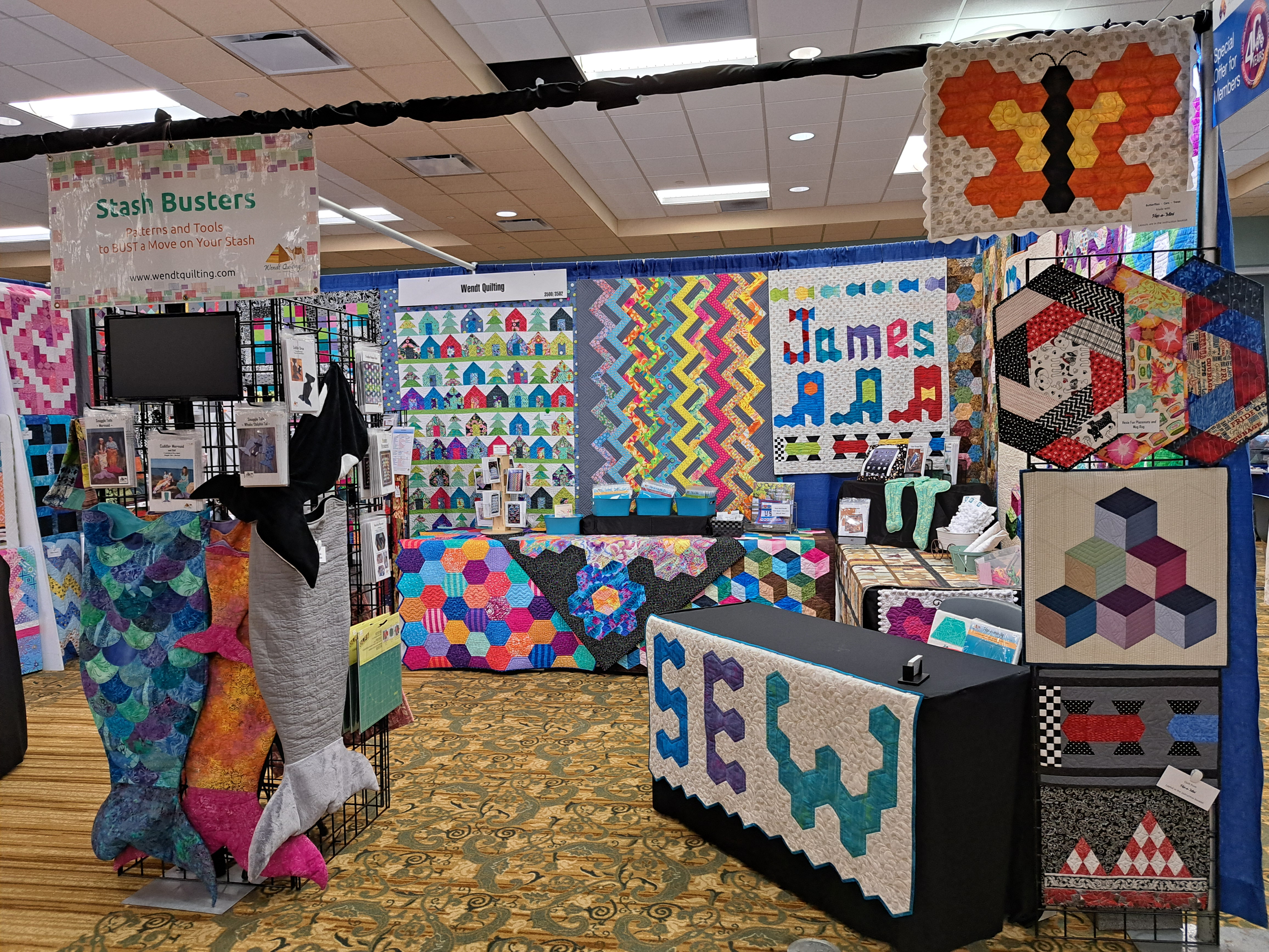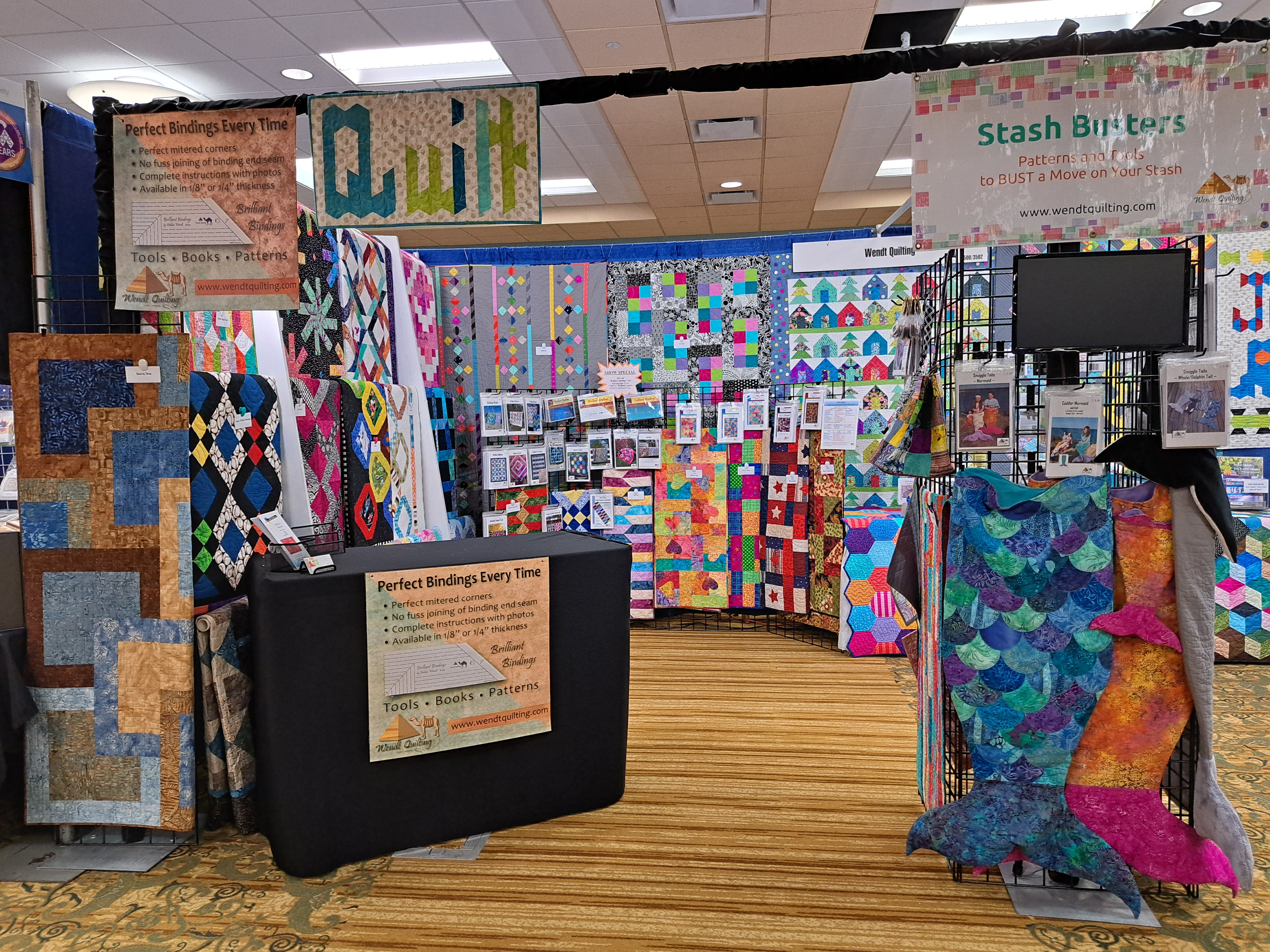 AND…..Hello Paducah!!! I’m here for Quilt Week! My booth is #3500/02 on the second floor of the Convention Center. I’m teaching my lecture, Bindings- A World of Options and my class Done by Three. The class is sold out and there are a few spots left in the lecture. I hope you’ll stop by to shop and say hello! My booth is set up and ready. We had preview tonight. I’ll be doing a Learning Center talk first thing tomorrow at 10 in the Pavilion (“the bubble”) join me as I show…Patterns and Tools to Bust a Move on Your Stash. Booth photos…left side, right side and outside “wall”….