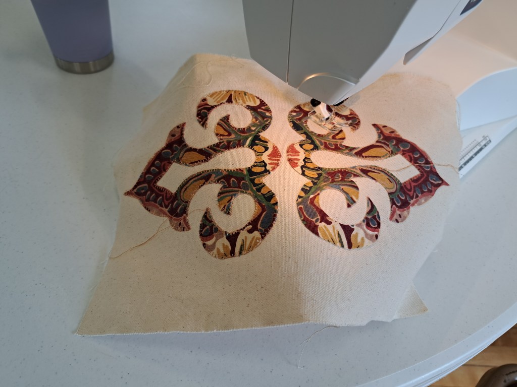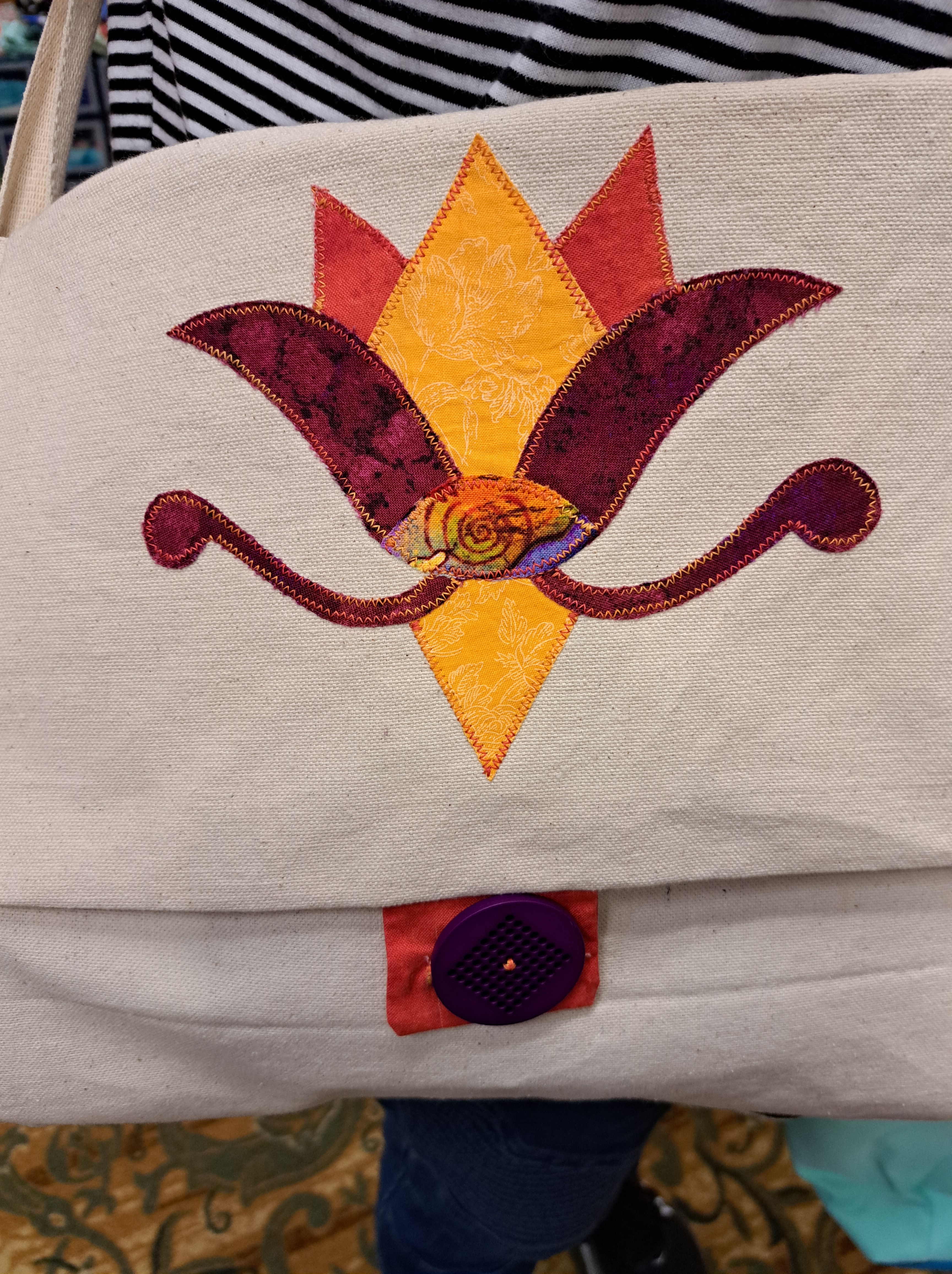 It has been a couple of VERY busy weeks! I got to teach in Vermont for the Maple Leaf Quilters. We had so much fun learning the Tentmakers’ style of applique but using machine applique instead of by hand. I also did a lecture for their meeting on Teaching the World to Quilt. Thank you ladies….(and Mary, the guild will understand). We shared lots of laughs and great quilt conversations! Nancy and Virginia came by my booth tonight in Paducah for the the opening night of Quilt Week. Nancy finished her Messenger Bag from the class! Well DONE!!! I love her color choices and the added button.