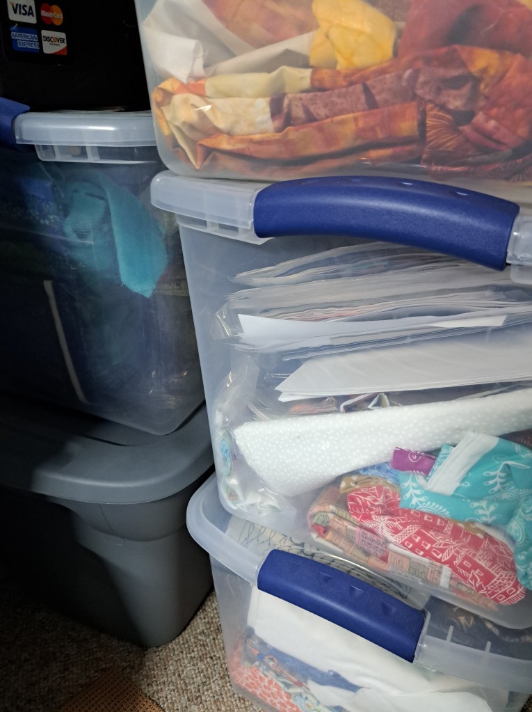 I’ve learned over the years to keep the bins smaller. Don’t get huge bins that you can’t lift when loaded with fabric!! I use the “shoe box” size for specific projects (if they fit). (This is an old photo. <grin>)