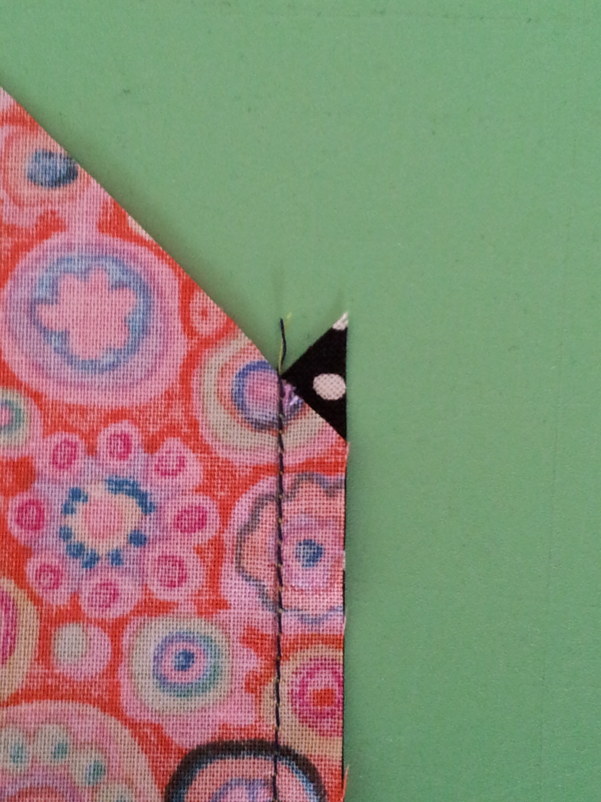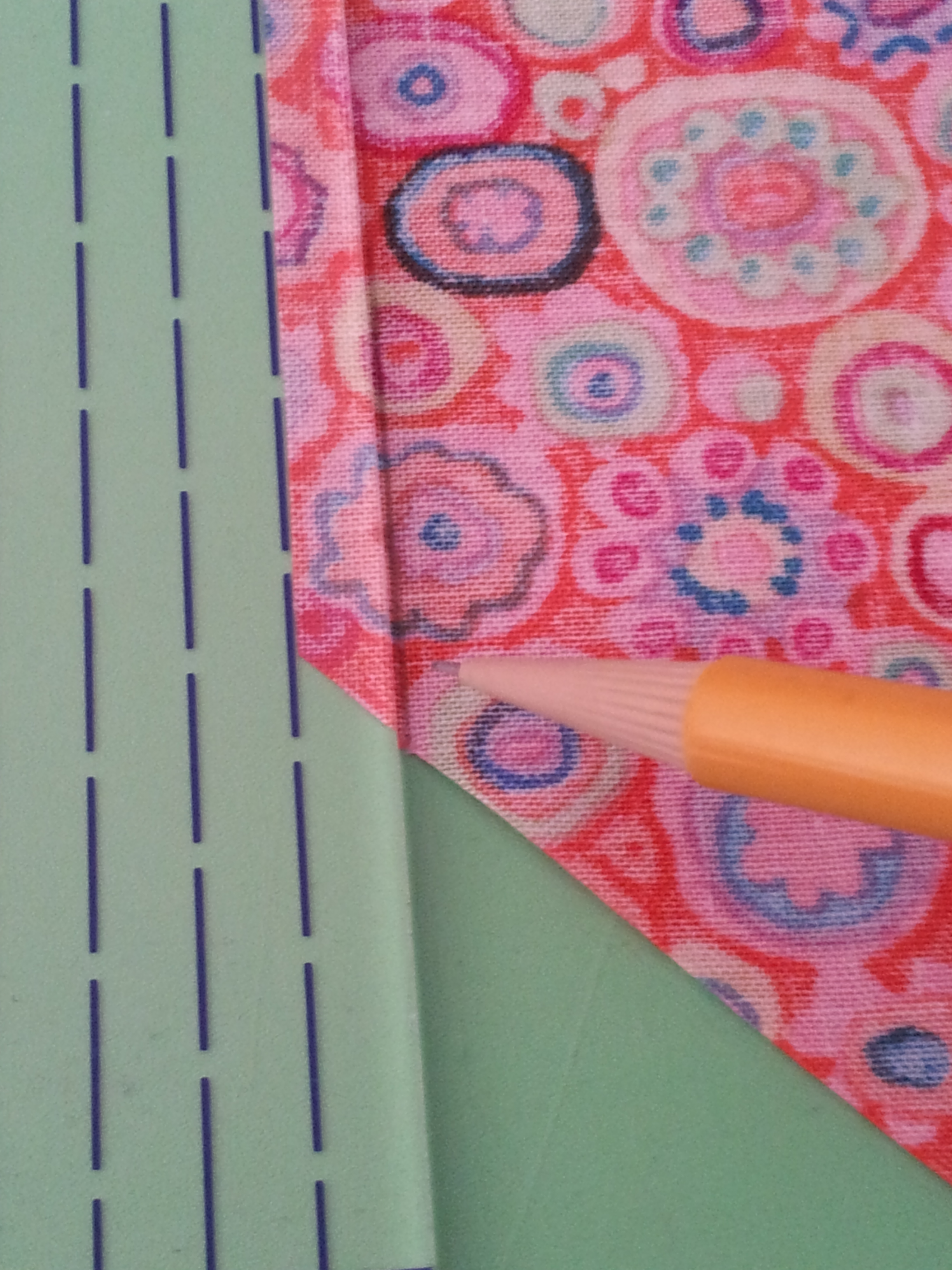 Mark the 1/4″ seam line when sewing an angle piece to a straight piece. This is very similar to sewing continuous binding strips together.