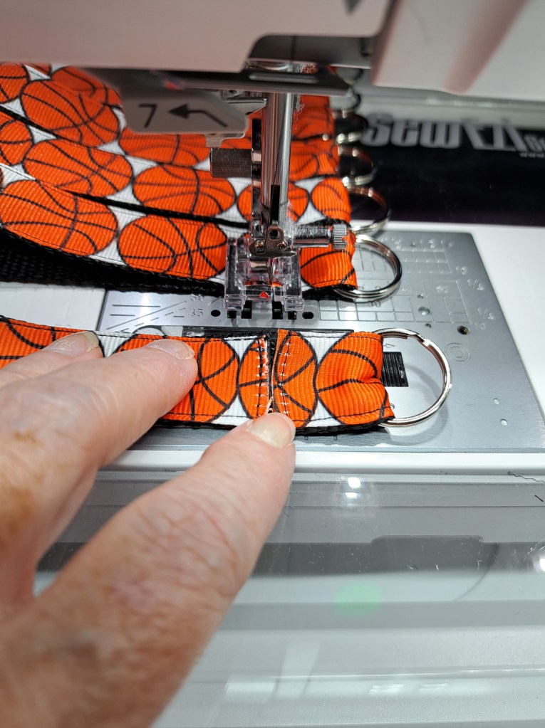 2 – Add a split ring to one end and fold so the ends meet near the split ring. About a 1″ down from the fold. With a wide zigzag, stitch across the butted ends to join.