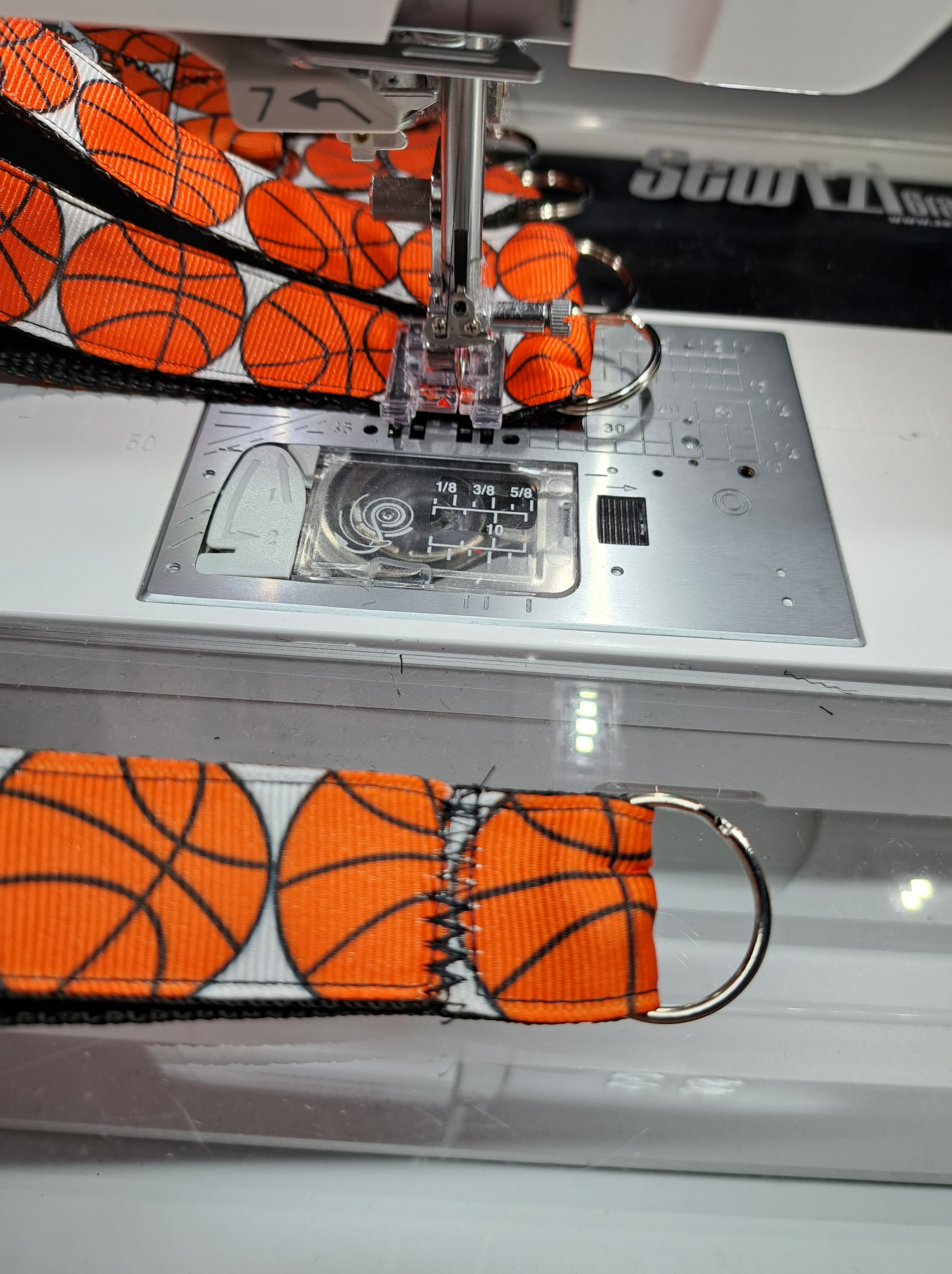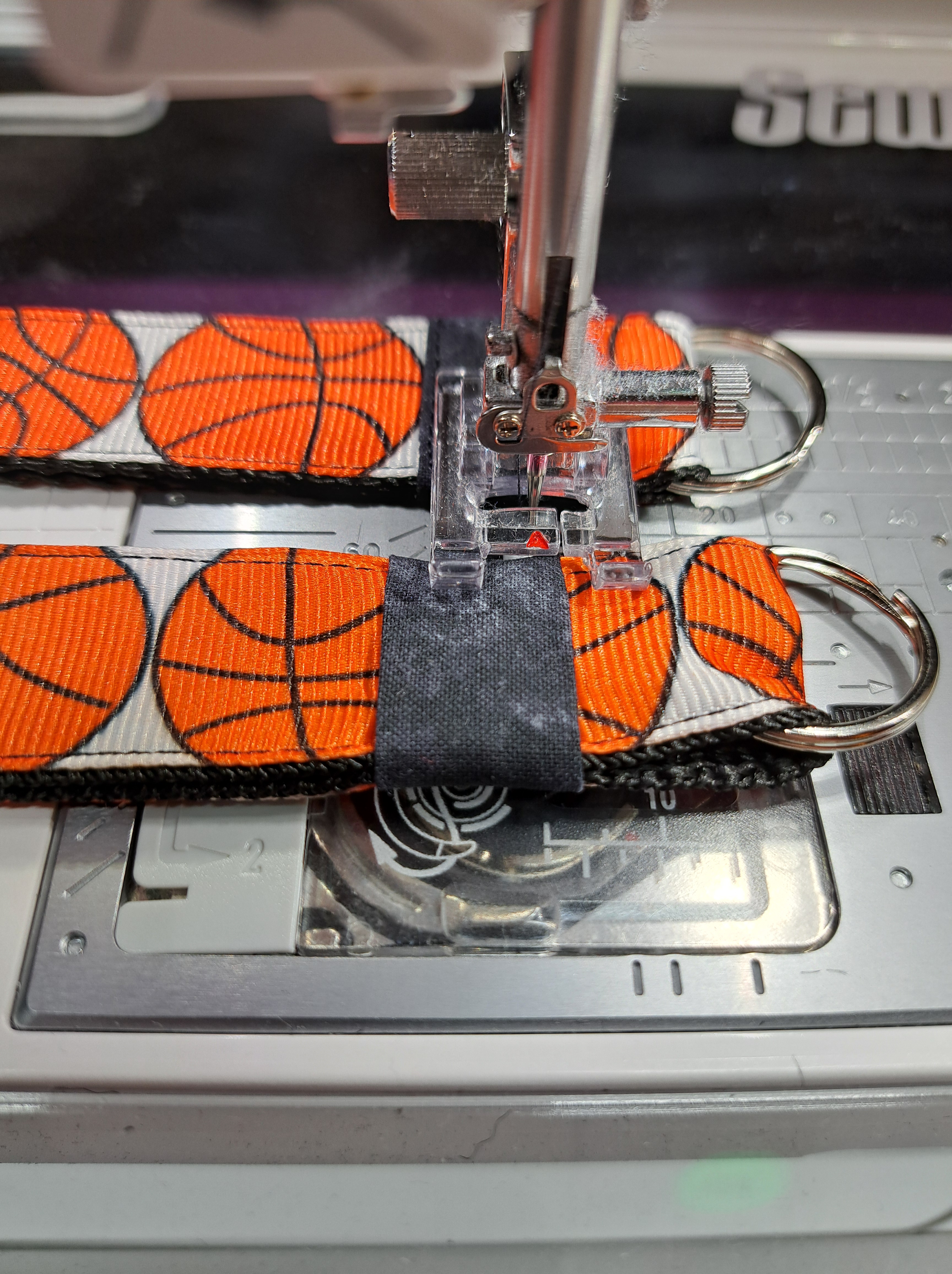 2 – Add a split ring to one end and fold so the ends meet near the split ring. About a 1″ down from the fold. With a wide zigzag, stitch across the butted ends to join.