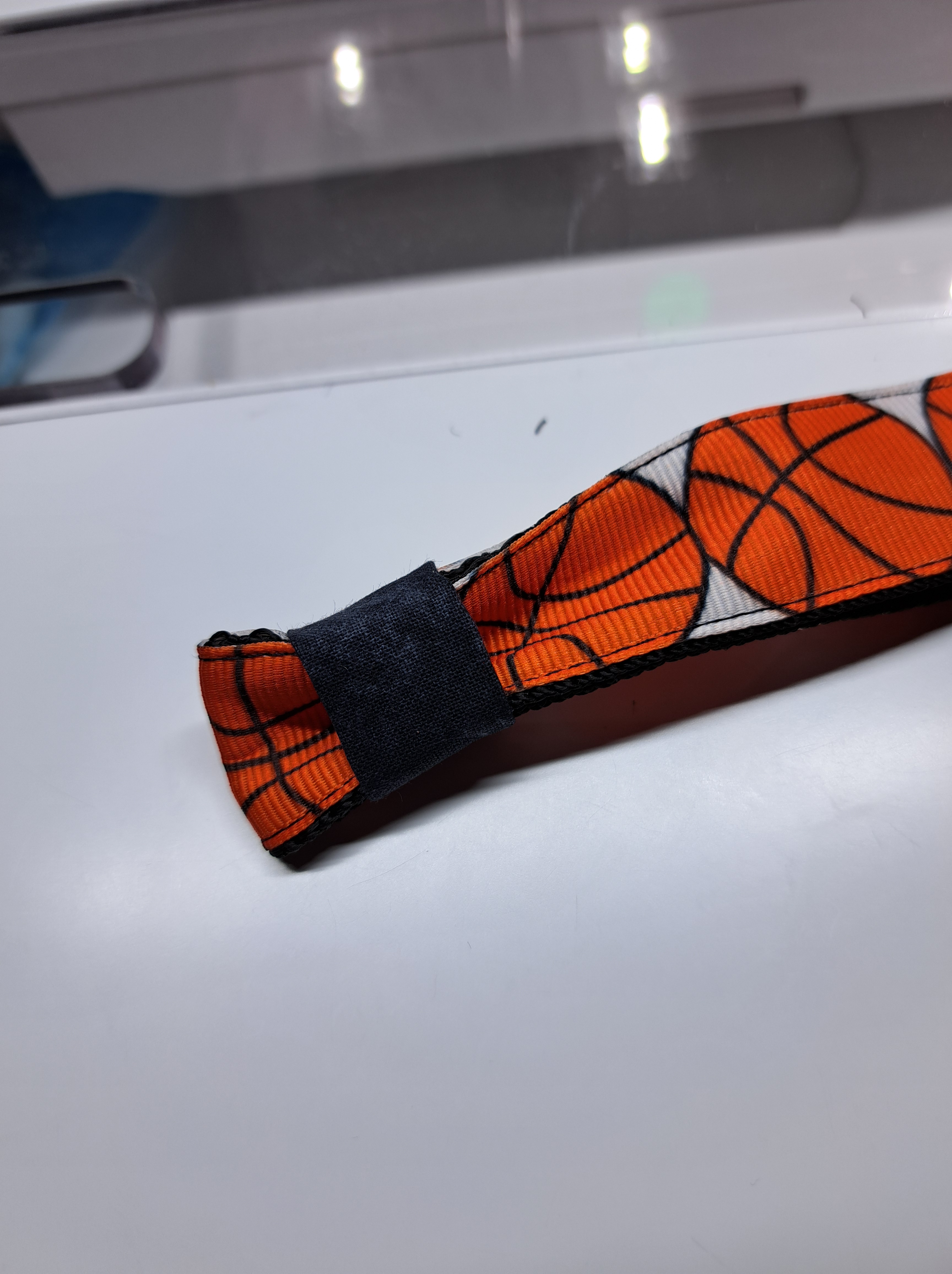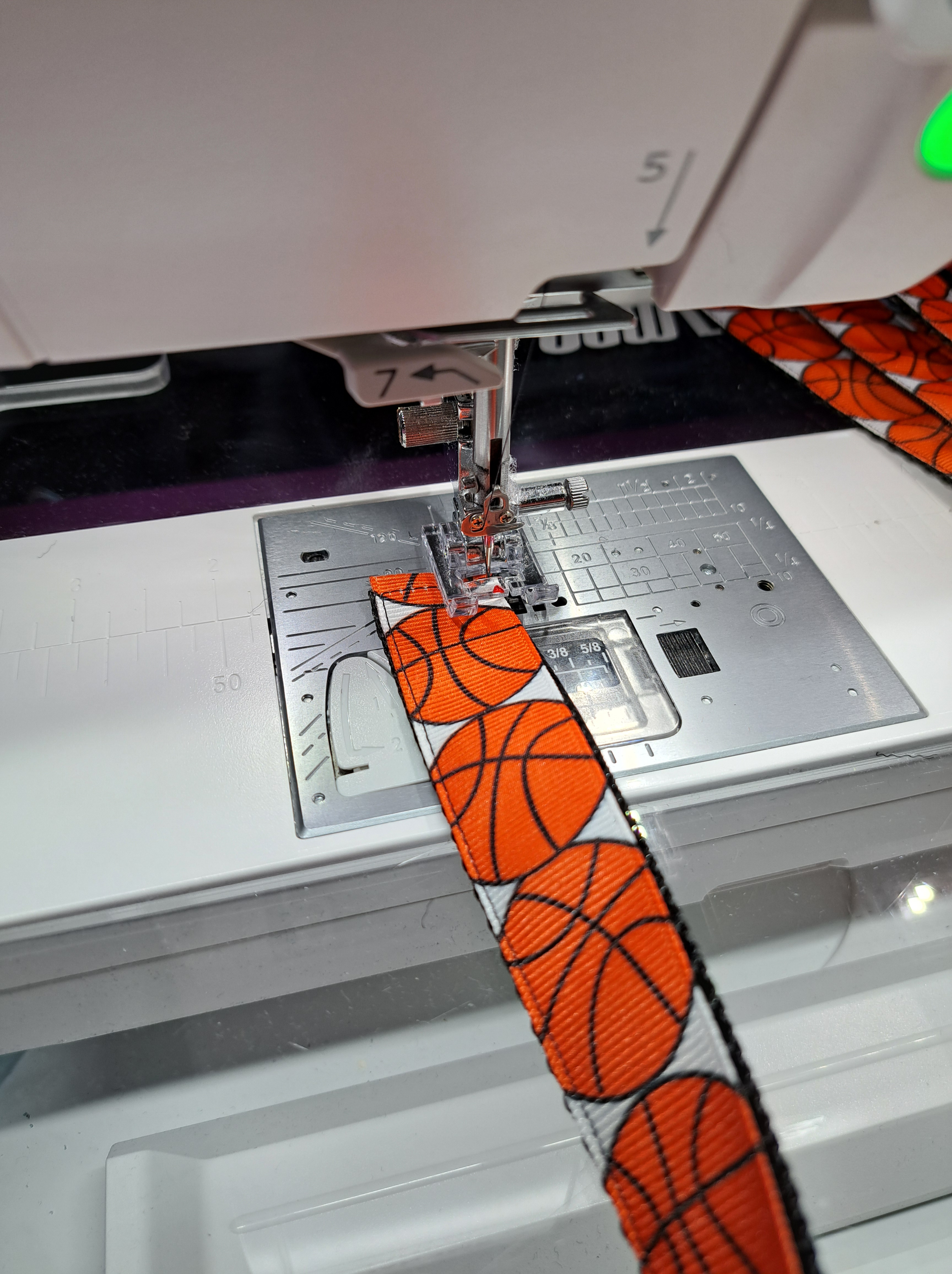 1 – I used 12″ of webbing and stitched the same length of ribbon onto the webbing down both edges. I did melt the ends of the webbing and ribbon so they would not fray.