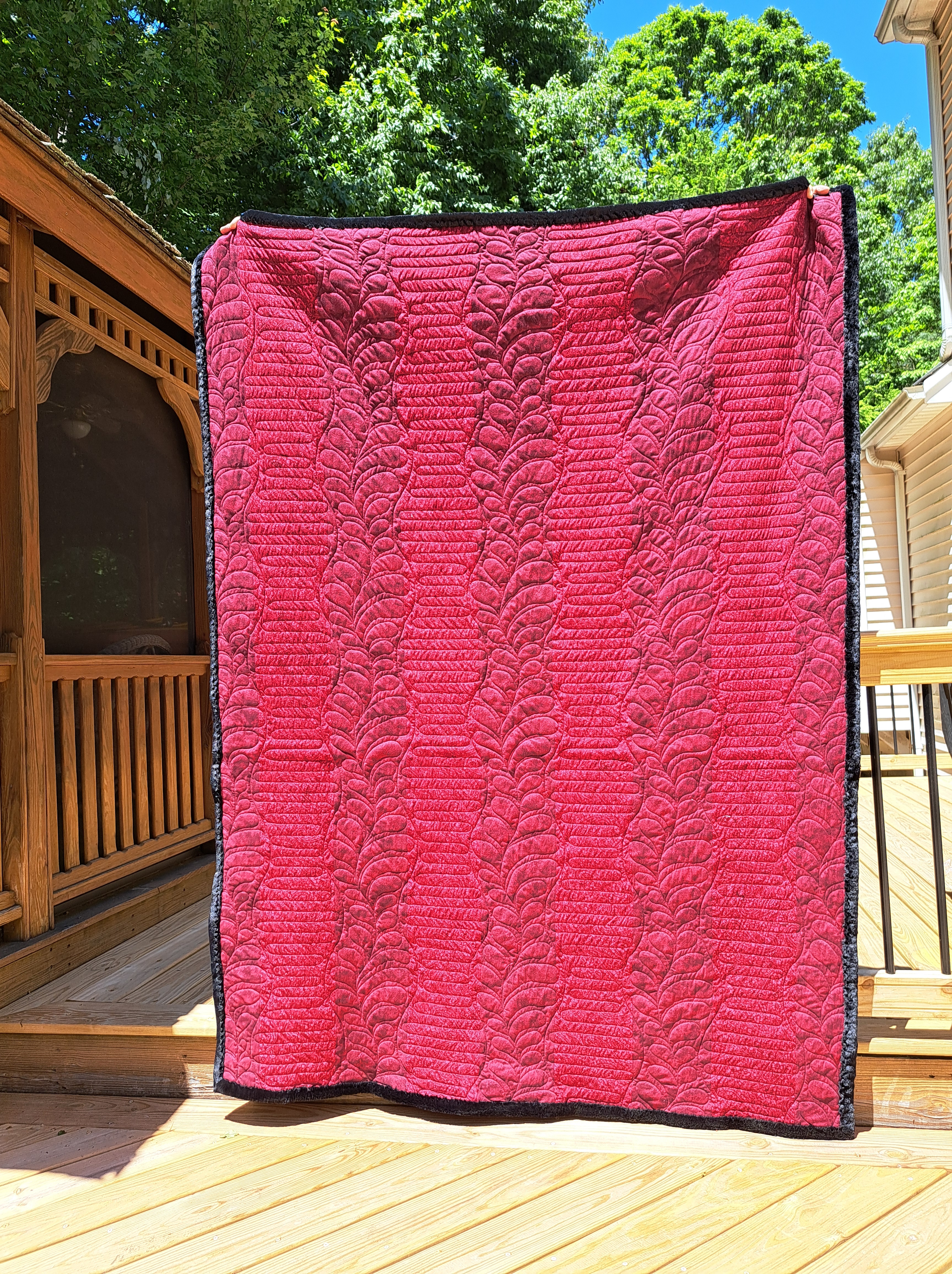 I asked Hannah at the awards ceremony what her current favorite color was…Deep Burgundy Red! So off to one of my local quilt shops (Appletree Fabrics) in Auburn to make my fabric purchases. I found two that went perfectly together. One is Batik, the other is not. NO problem in my book! I know some of you will shudder at the idea of not putting all batiks in the one quilt, but I’m totally fine with it when they work well together!!! I used my favorite design of a strippy quilt (it goes together so fast) and quilted the Feather Strippy Bar pantograph by Kathie James. This is my go to for graduation quilts and I have done several over the years! The strips are cut 7 1/2″ wide x the length you want the quilt. Arrange in the order you prefer and you have a quilt top in a couple hours. I based my number of strips by what be a good width for a Cuddle Minky backing. Plus, I like to roll the Cuddle to the front for a back to front binding for a yummy soft edge. The outside strips were cut 5 1/2″. I added Hobb’s 80/20 batting since it is lightweight and will add that quilty feel. The fabrics were purchased on Wednesday and the quilt given on Saturday, with a bunch of breaks and meals. YES, it is that fun and fast to make. So, here is the result…