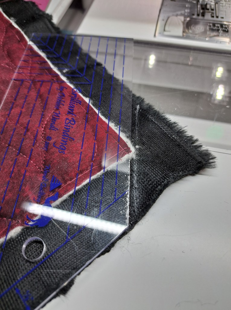 - Draw a line at a 45 degree angle to the edge of the binding at the corner of the quilt top. My Brilliant Bindings tool works perfectly by placing the 45 angle edge of the tool along the outside edge of the binding. I did leave 1″ of backing beyond the quilted top.