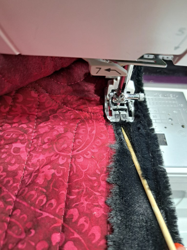 A back to front binding is so easy, just a bit time consuming. I used a serpentine on my Janome and a wooden skewer to keep tabs of the nap of the cuddle at the edge of the Cuddle. The serpentine looks much nicer than a zigzag and a bit dressier than a straight stitch.
