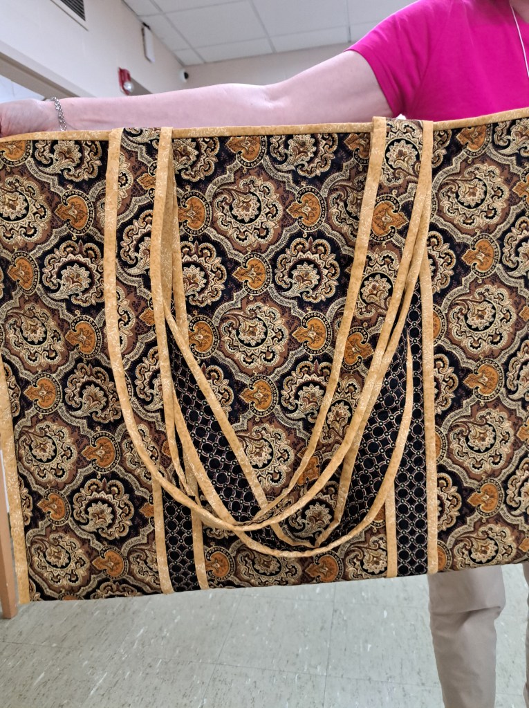 First up…. Flat Mat Bag. This is Lori L. and her Flat Mat Bag. She “purposely” turned one of the straps and we liked the sidestep to a unique finish. Both side of her quilted fabric is represented in her straps! Great job Lori! Her comment, “I love it!” It looks classy with the gold accents. I love it, too!