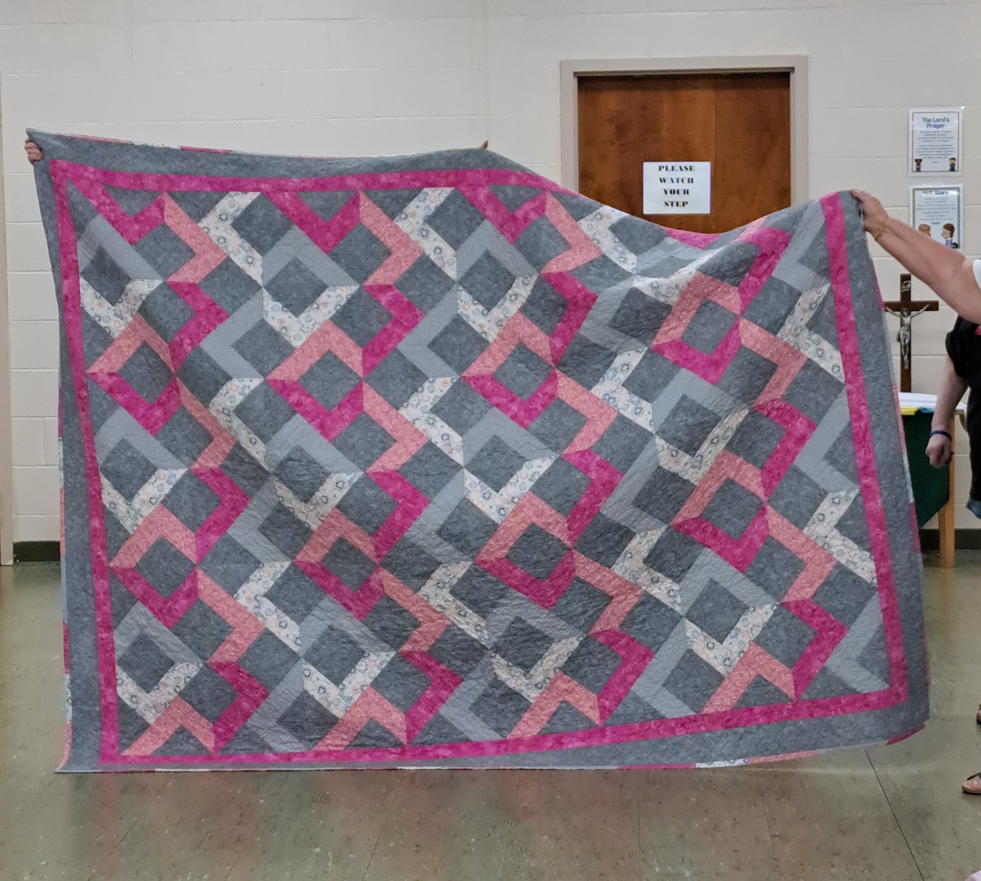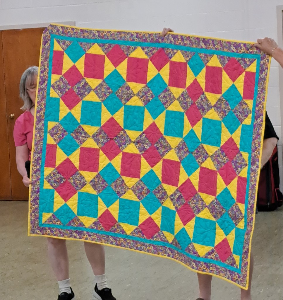 Second… Sylvia S. finished her R-W-B Boise quilt. No red, white and blue here! The colors are so bright and cheerful! Her friend has named this “the jimmy buffet quilt”. A great name for this colorful finished quilt. The quilting was done by a local longarmer, Pam Machamer. (“local” is just over the line in Connecticut, Twin Maples Quilting Studio) Nice quilting! Great job all ’round!