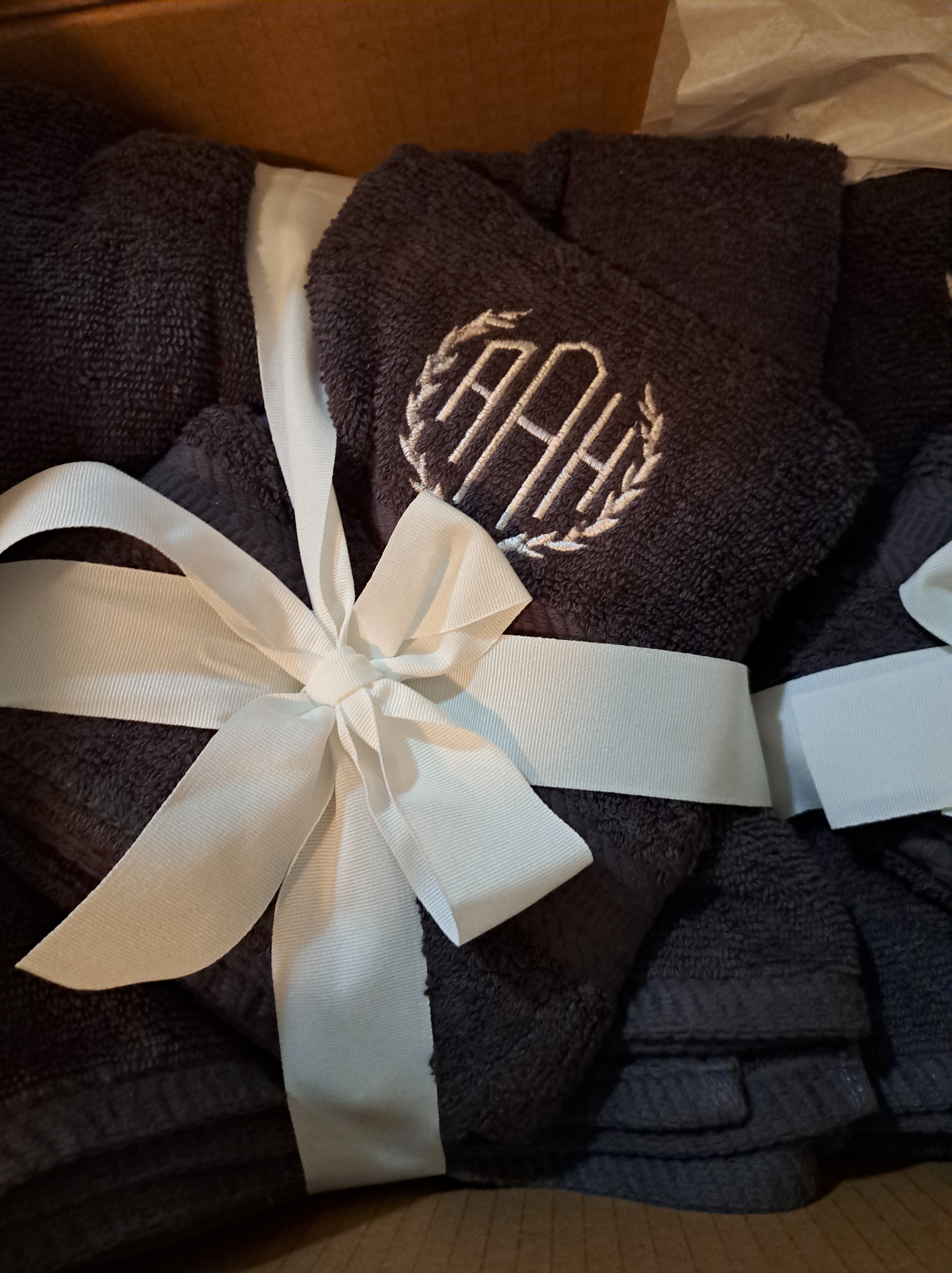 Another yay…I attended a bridal shower for a nephew’s fiancé. I LOVE giving monogramed towels. All my married nieces and a granddaughter have said they loved getting them and put them out for special occasions. Fun and functional! Plus a great way to use your embroidery machine if you have that capability. These were done on my OLD Janome 9000.