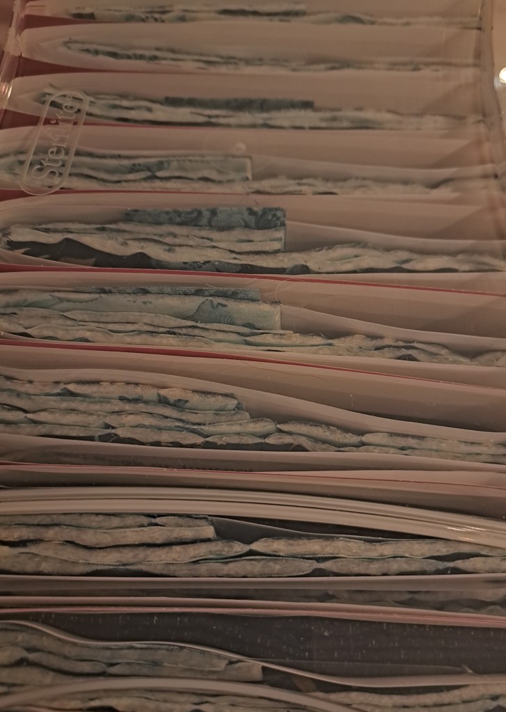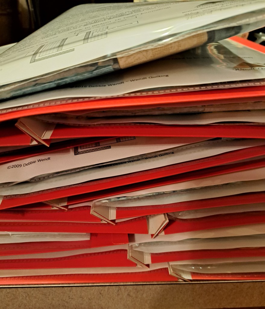 Pieces quilted and cut, bindings cut, folders prepared and packed in bins ready to GO.