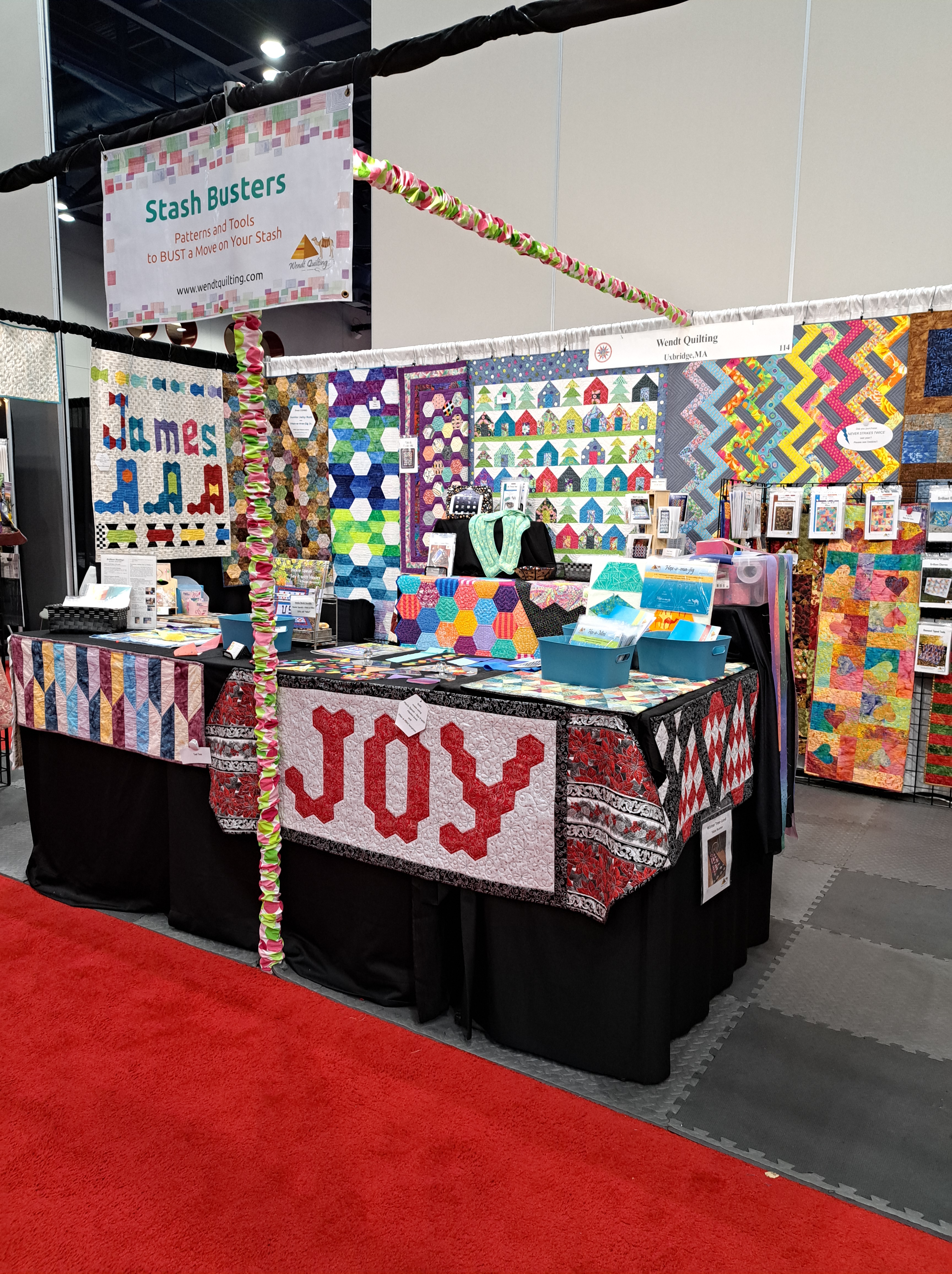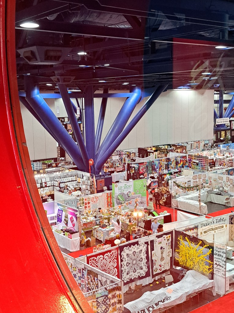 The port hole windows on the second floor of the George R. Brown Convention Center are a must to peek through to see the show floor. My booth is against the wall between the show quilts and the vendors just to the right of the giant blue structure. I put Wendt Quilting just above my booth….find JOY on our front demo table.