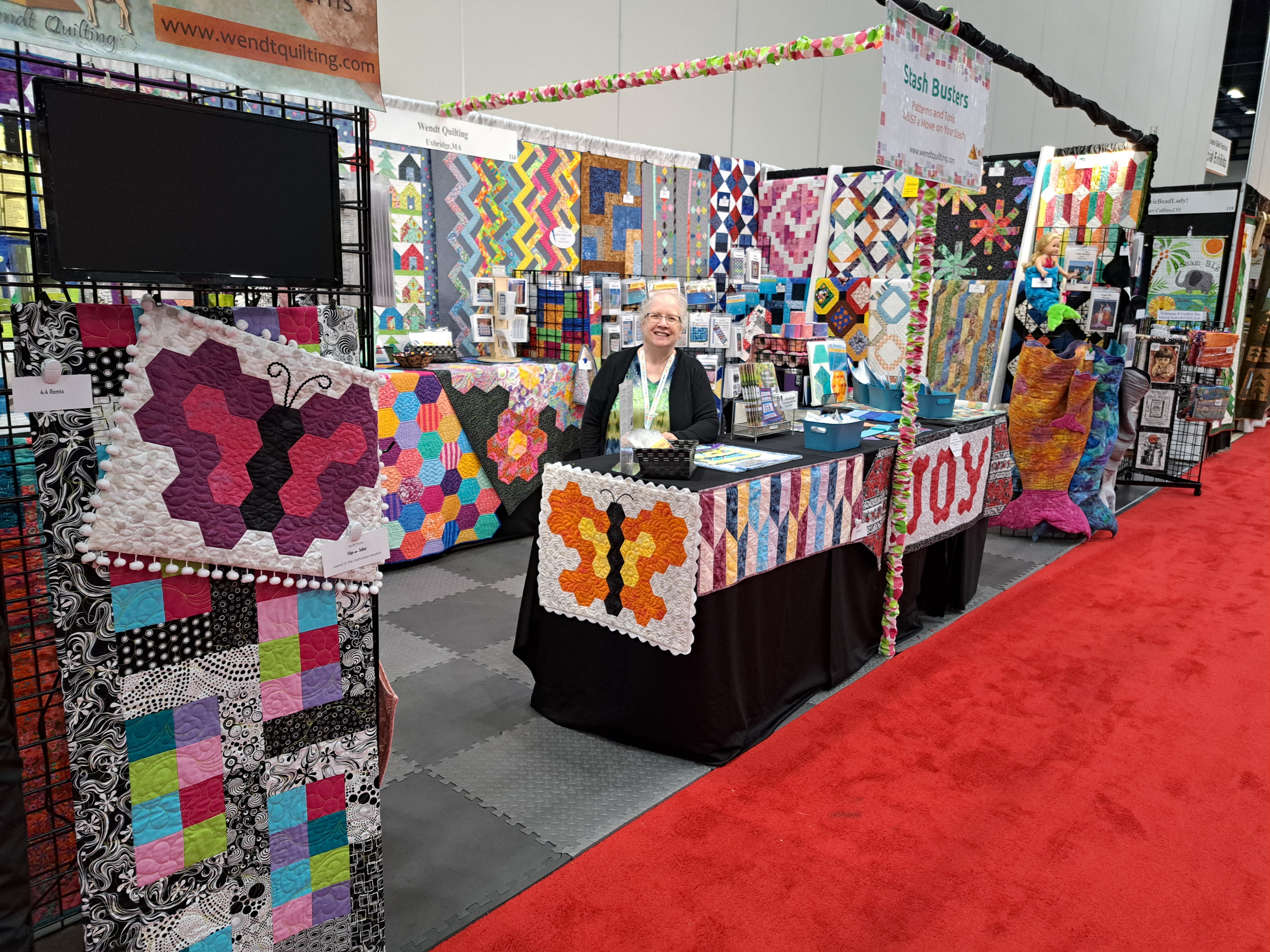 I always enjoy talking with shop owners and teachers “in the business”. My friend Nancy Hinds helped me in my booth and talked about what Wendt Quilting has to offer. My new pattern Winter Tree-Land table runner got outshined by my Sparkle Knobs(TM).