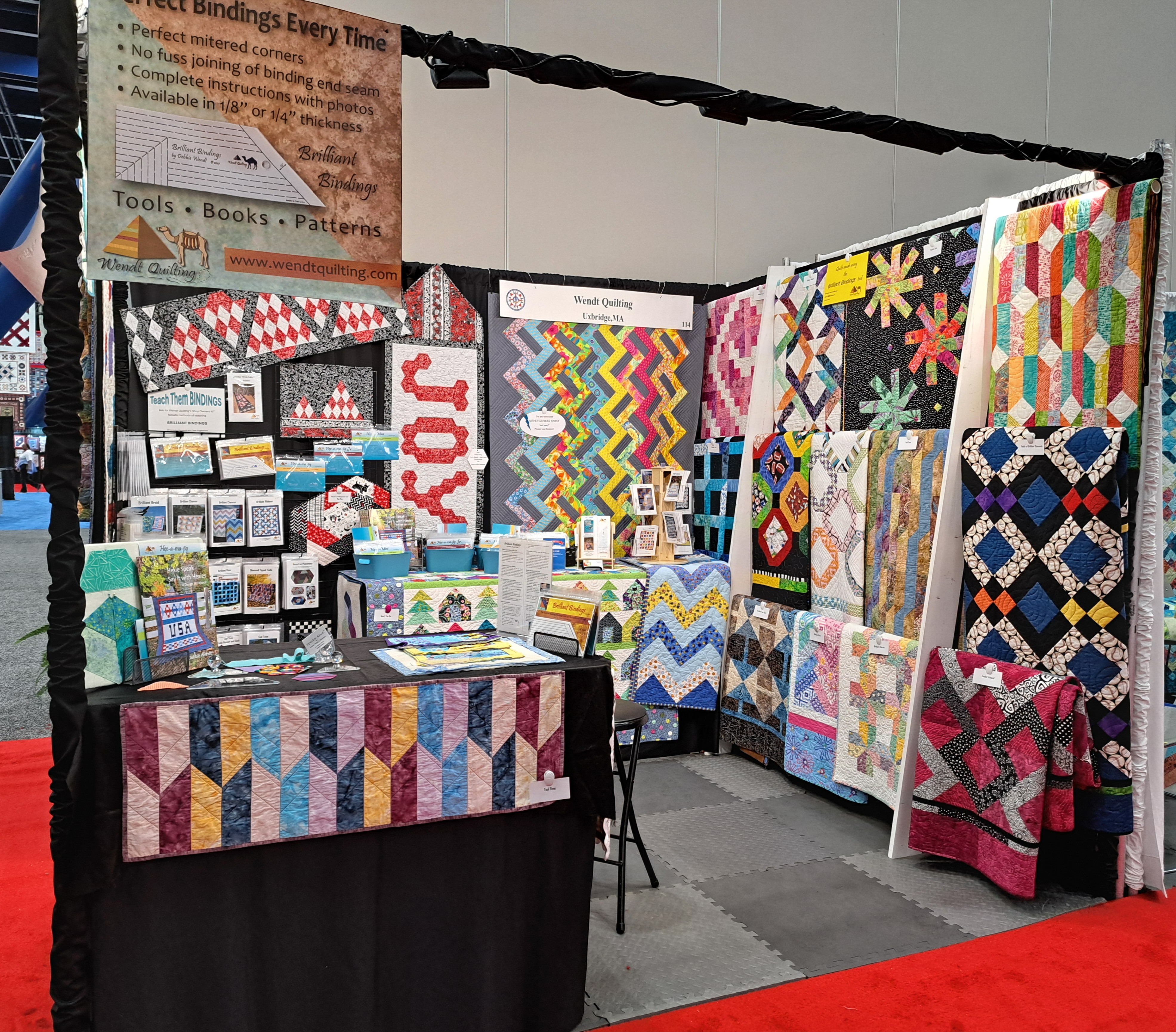 We did the quick change from my Quilt Market Booth to my Quilt Festival Booth. I expanded to a double booth and LOVE how I had room to display so many quilts and a demo area/table for both Brilliant Bindings and my Hex-a-ma-jig templates and Hexie Speak book!!