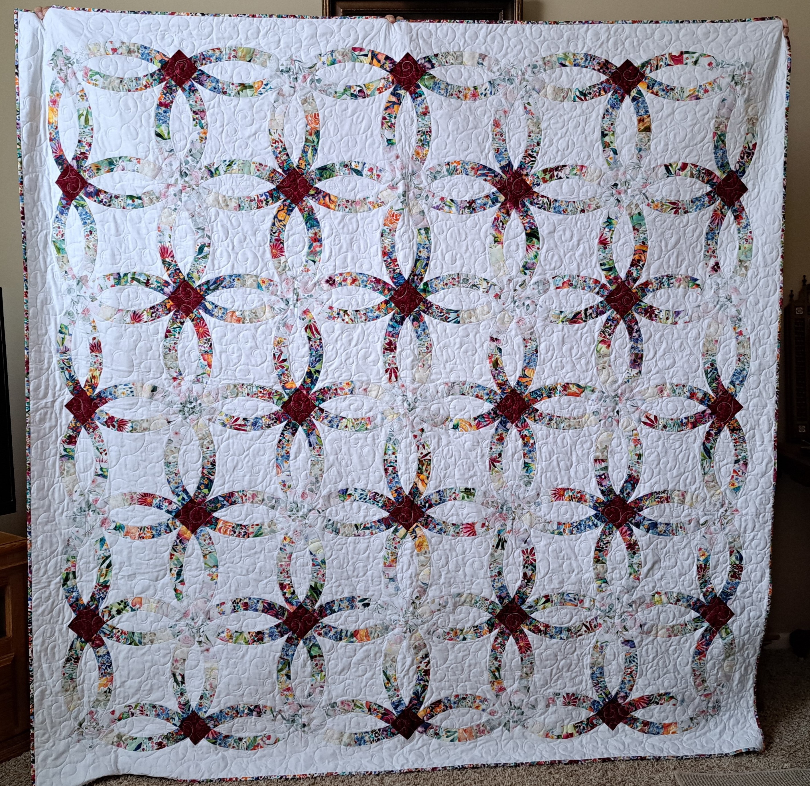 I was on a plane yesterday getting home since my flight was cancelled on Monday. HOME! The ice and snow in Kansas City, MO and all around the metro was crazy. Thank goodness my nephew’s wedding happened the day BEFORE the ice started!! His wedding quilt, a double wedding ring, was my last finish off 2024 and thus the first given for 2025. Andrew and Hannah had a beautiful ceremony!! The quilt I made for them is below…