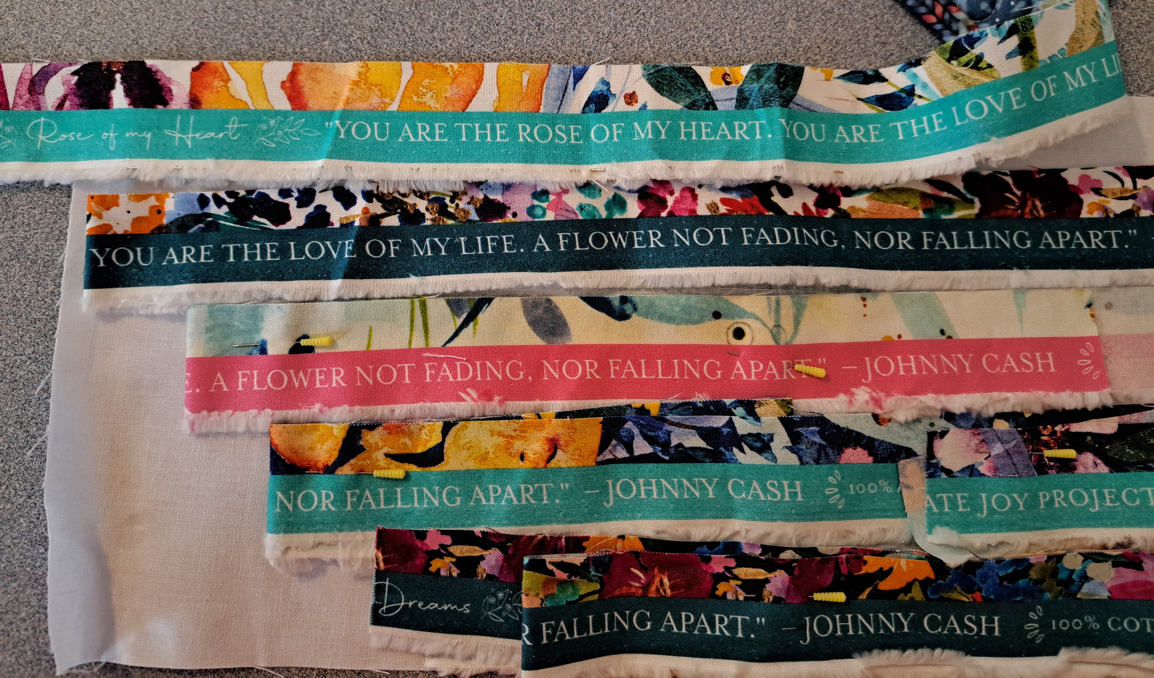 They requested a double wedding ring quilt. Hannah loves flowers and sent a photo of one she found on the internet that shaded from dark to light, all florals. Finding just the right fabrics took some time. I used the words/song/poem from the selvages of several fabrics that were all from the same fabric line on the label. Create Joy Project by Moda Fabrics. The saying is
