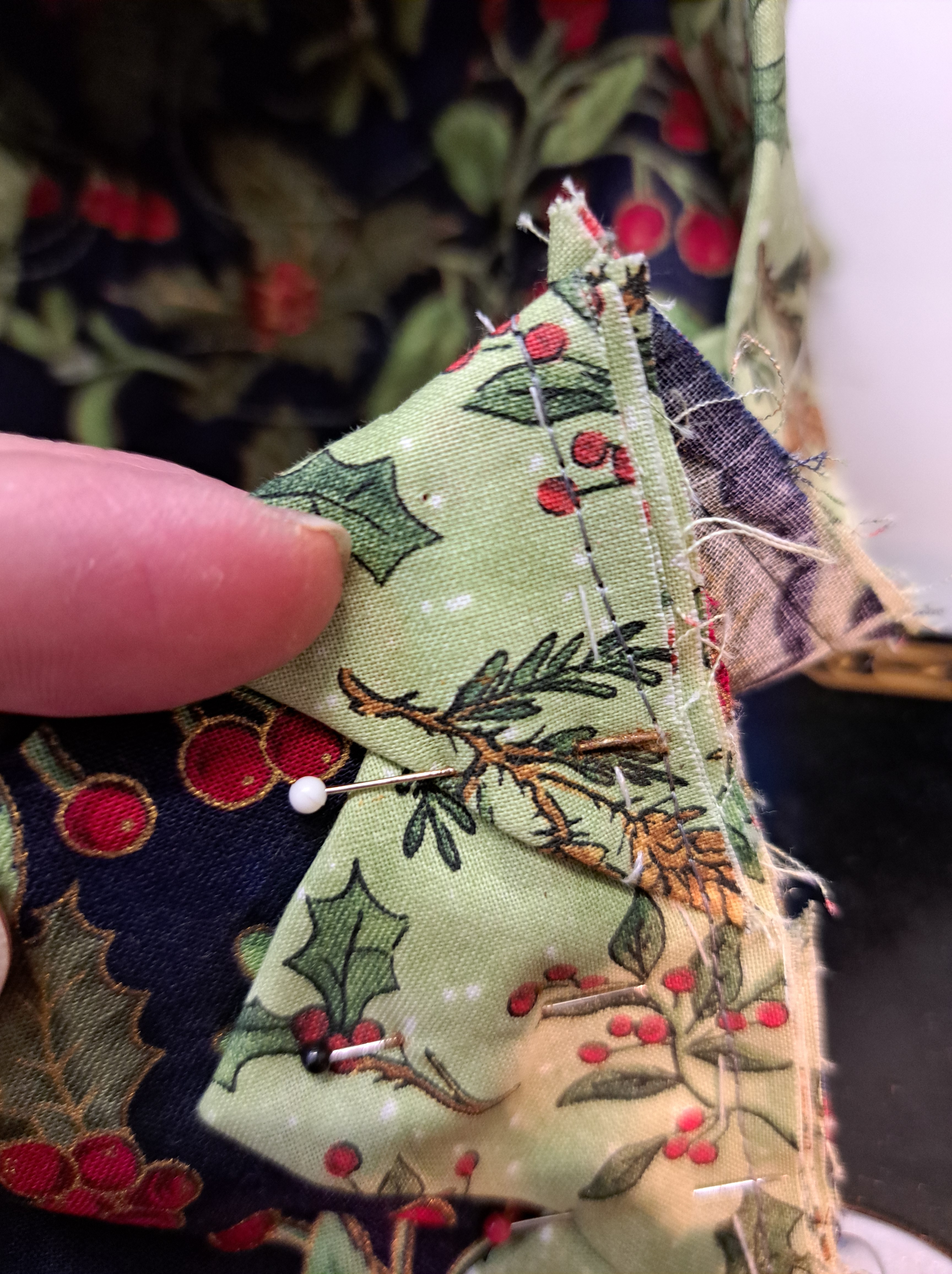 I’ve been working on a project left behind by a friend. The quilt has prairie points on the outer edge. I am trying to figure out what she wanted so I can pass it on to her daughter. Prairie points pointing in the quilt or pointing out beyond the edge of the quilt? I’ll see which looks best before I add the binding. The OOPS! She had the prairie points left in place with pins. I’ve had the quilt a couple years and I don’t know how long the pins have been in the fabric before I received it to finish. And look what happened…
