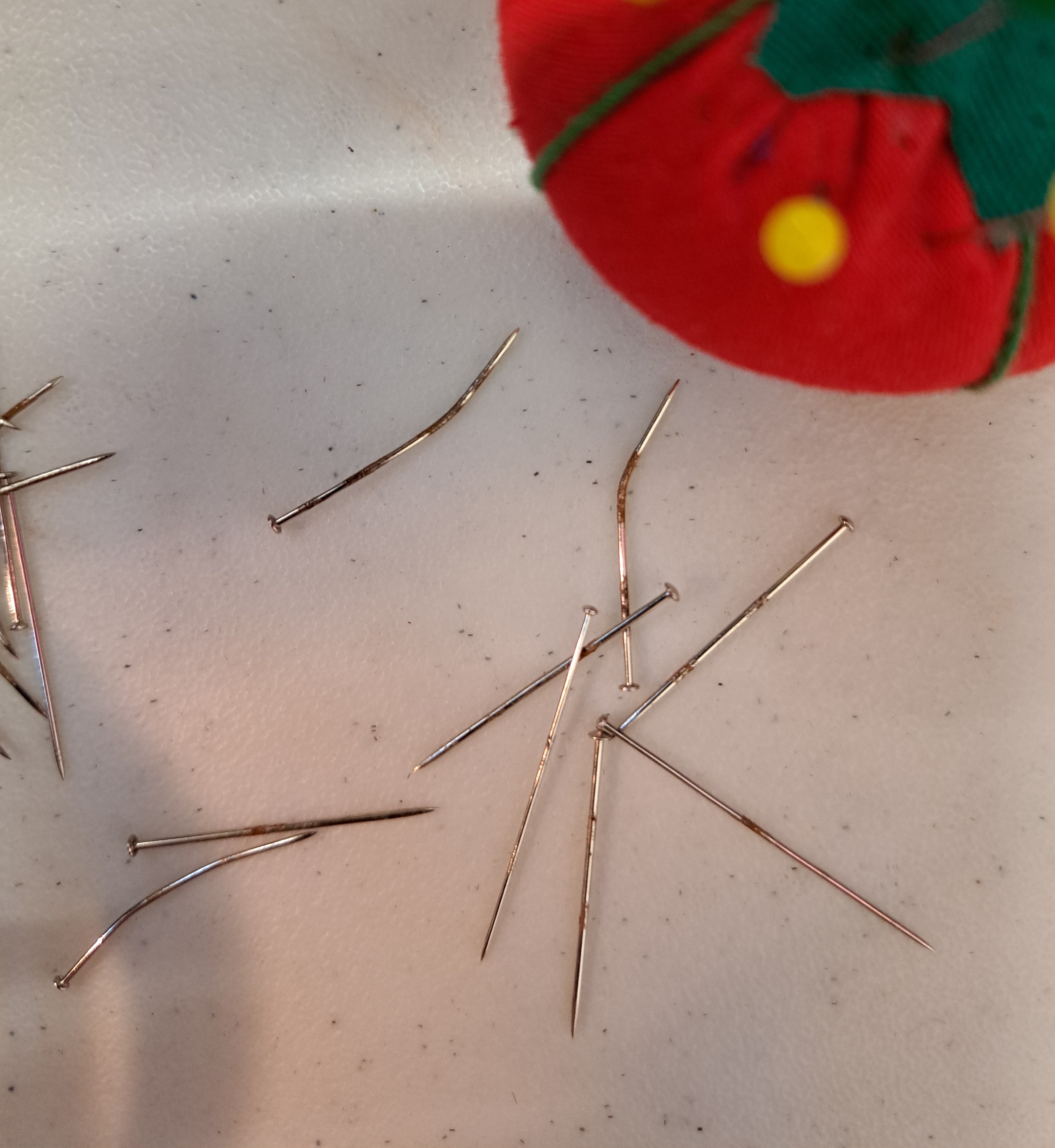YES, the pins rusted in the fabric. I am having to scratch off the rust to get the pin out of the prairie points. In some places, I’ve had to force the pins out of the fabric. Here is just a few I’ve taken out so far. In the trash they will go. I won’t just toss them in the trash. I will wrap them up so no one will get stabbed by them, just to be safe.