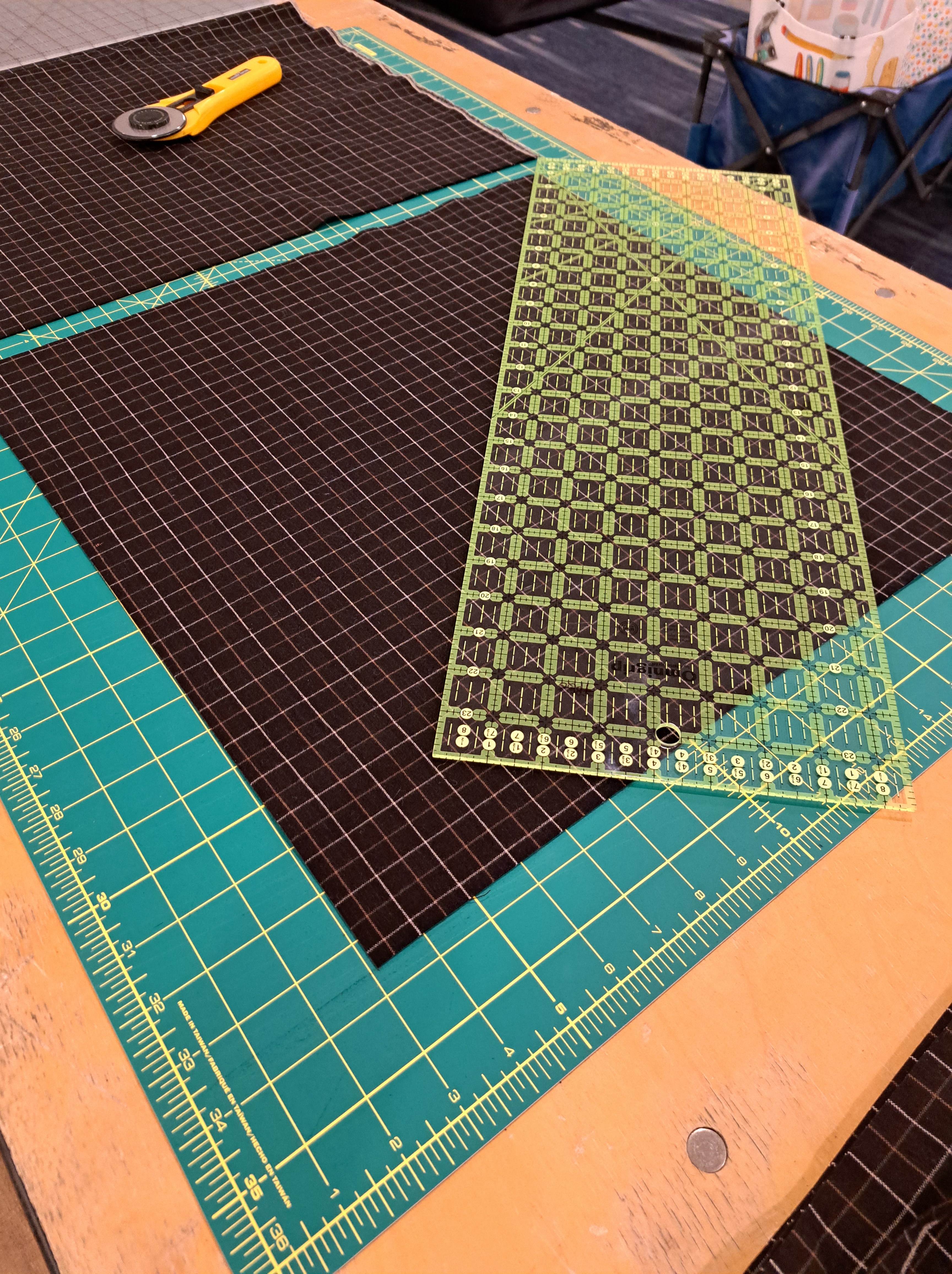 I usually do as much prep as I can at home, but this time I waited and cut at the Getaway. I knew we would have cutting tables set up for us to use. It is easier to use a large mat there, instead of at home. I needed to cut large 19″ squares to cut into side triangles. To do this I cut the square diagonally twice (from corner to corner, both directions). I do not have a ruler that will span the entire length of the diagonal. So I use 2 rulers to accomplish the cut. (Nice that our guild has rulers we can use!)