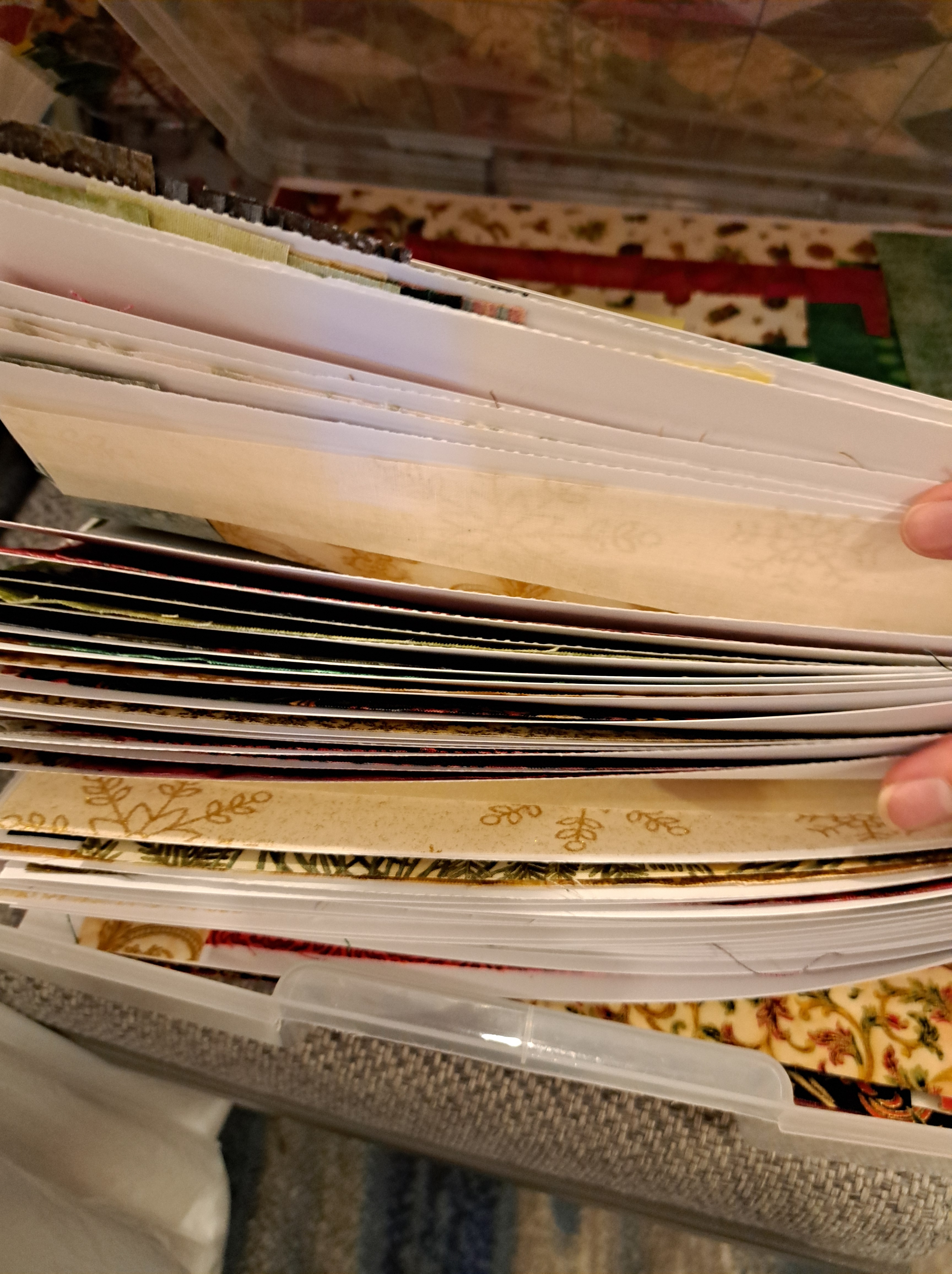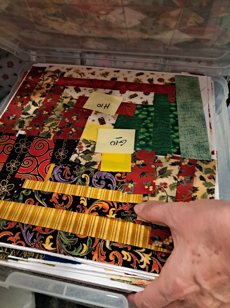 Many do prep AHEAD of going. More time for sewing! My friend Shari is a master planner and super preparer of blocks. Just look at her small centers and larger pieces. They are all LABELED!!! Plus she organized each block in layers, upon layers, of blocks! It sure made her piecing easier! All of the blocks were in a 12″square plastic box.