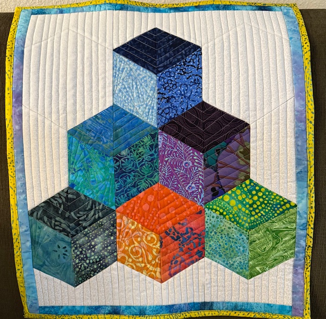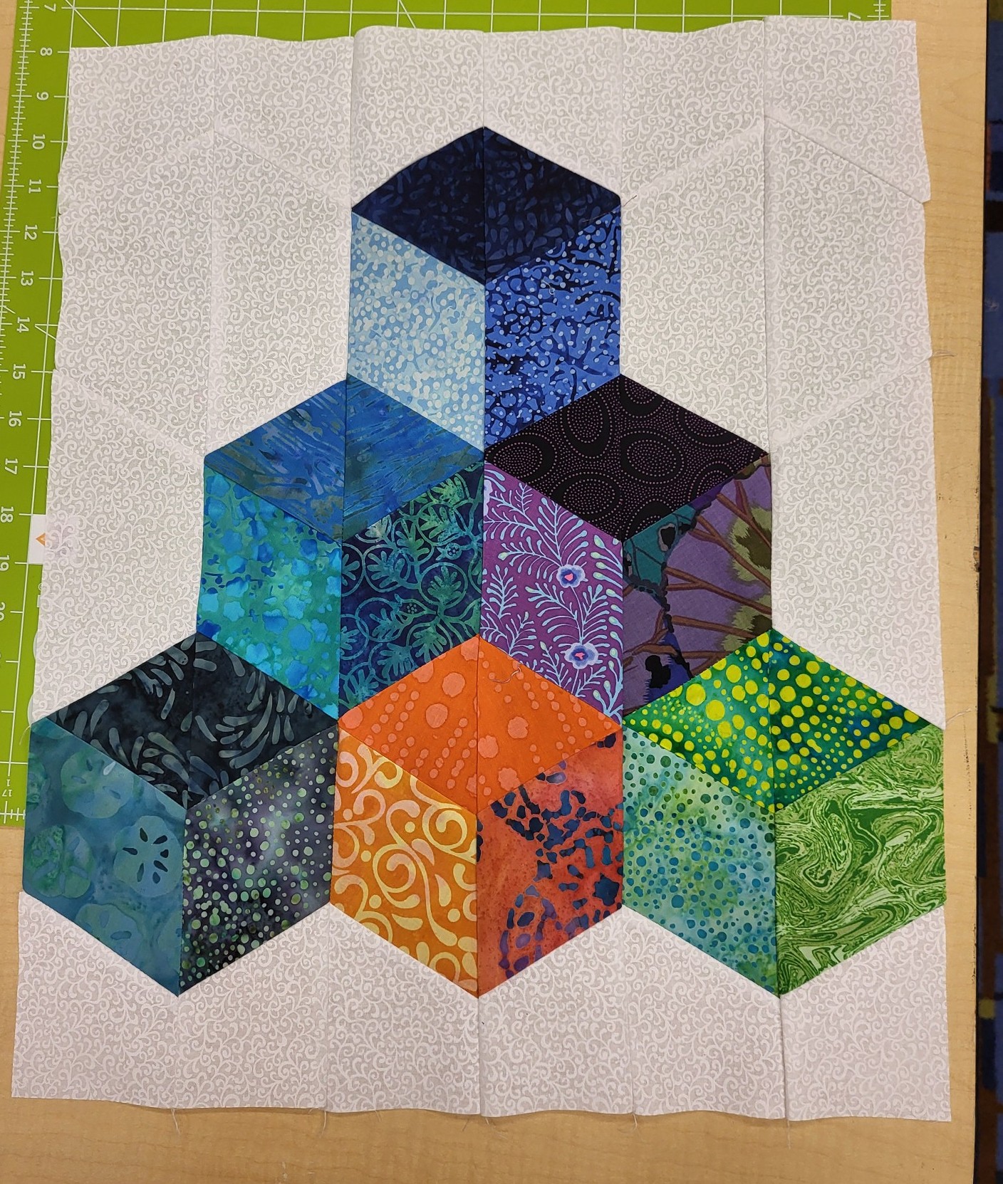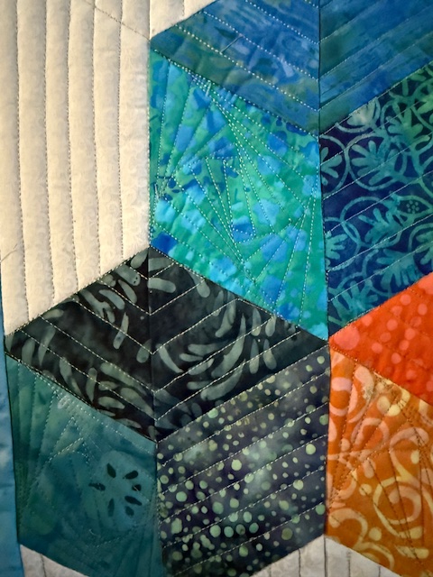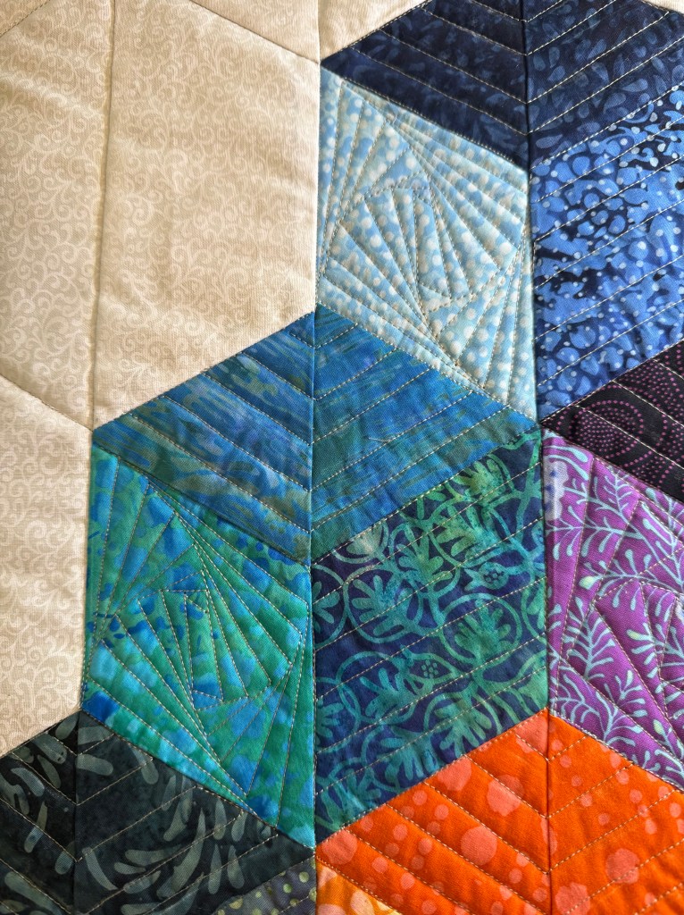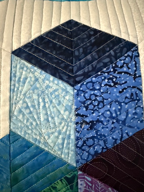 In my classes at the show, we learned Bindings (Become a Brilliant Binder), Simple Shapes (Simple Piecing is the Cornerstone) and Strip pieced Tumbling/Baby Blocks (Oooh Hexie Baby). I have photos from Oooh Hexie Baby! Many students had their blocks packed up when I remembered to start taking photos. I was so pleased with how far they all got with making blocks. I’m looking forward to seeing more photos. (A hint to my students…send photos!!! Please!)