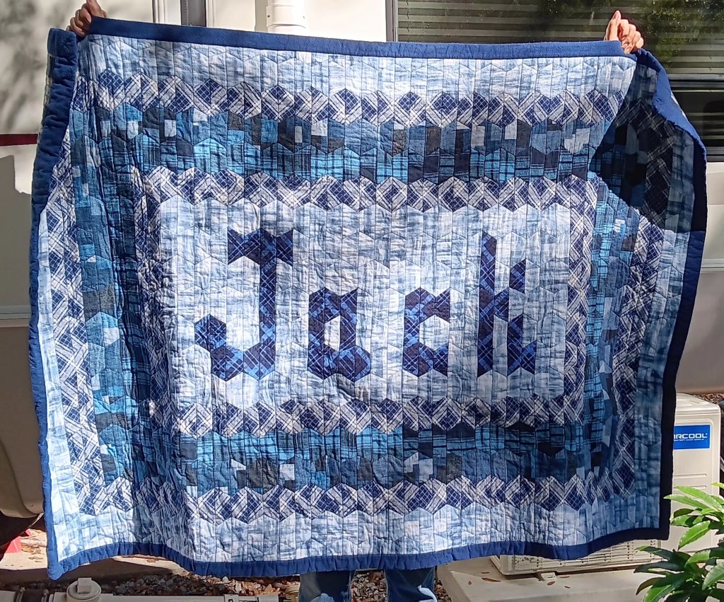 I love when quilt friends show up with photos of quilts they have made with my products. Look at this beauty made my Debbi C. The quilt was made for her grandson out of flannel leftovers from shirts and lounge pants she made for him. A true TREASURE!! Oh and by the way, this was her first quilt! How AWESOME is that. Great job Debbi!!!! The letters are from my book Hexie Speak – Say it with Hexies using Hex-a-Mini template.