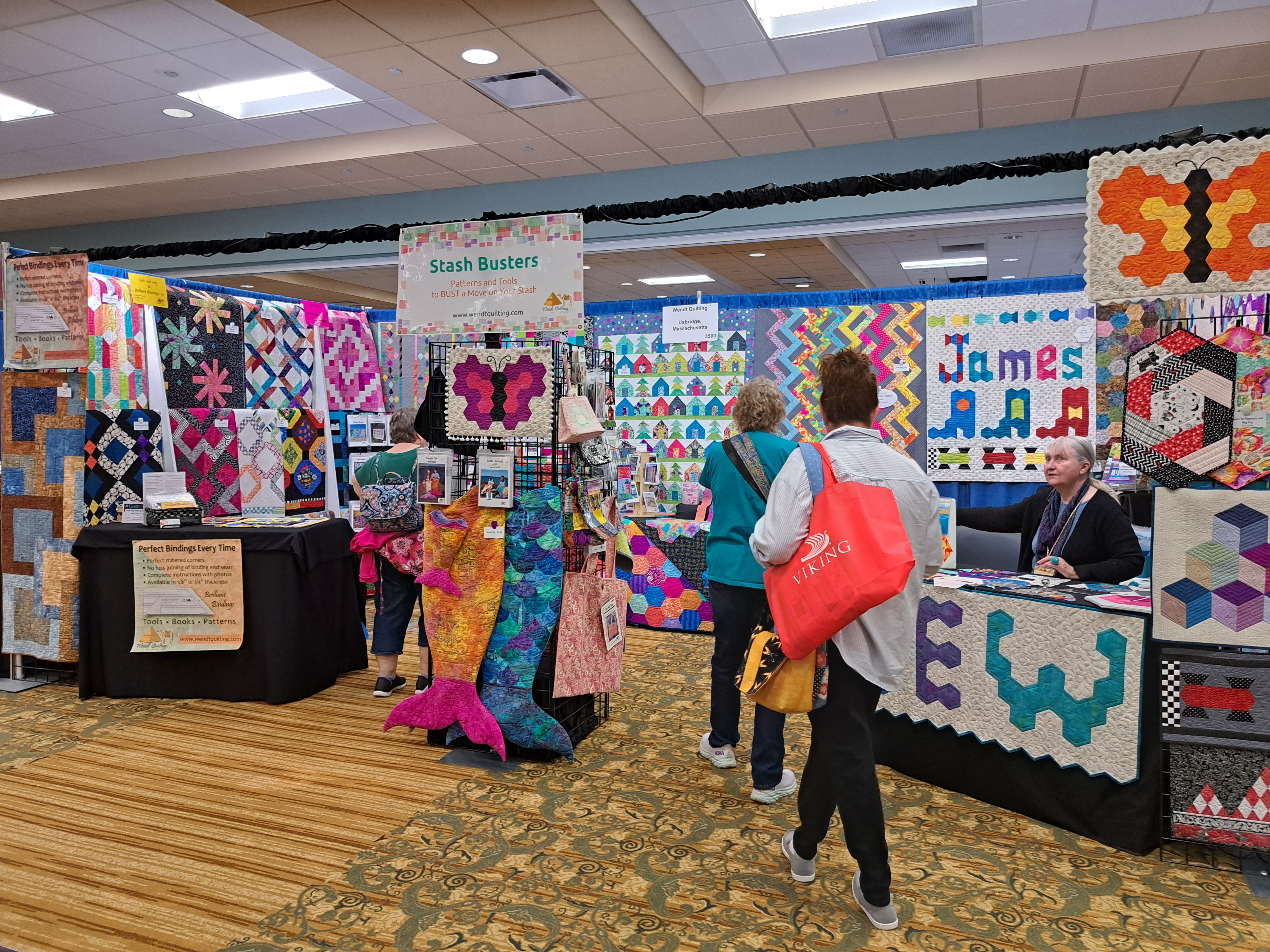 I’m back home from the AQS Quilt Week in Paducah, KY. A great big THANK YOU to those who shopped in my booth during the show. Thank you to my friend, Nancy, she can be seen on the right side of the booth demo-ing Hex-a-ma-jig in all three sizes and all things hexies. I was on the left side demo-ing Brilliant Bindings. (Not in the photo….I’m behind the camera.)